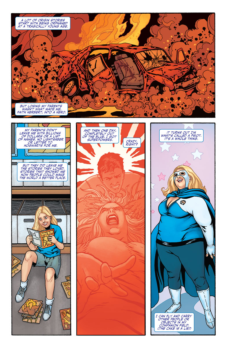 In a city under siege by robots, aliens, monsters and even worse… celebrities, there is only one woman the people of Los Angeles can count on: the stratospheric superhero called Faith! Aspiring reporter by day and dedicated crime-fighter by night, Faith has tackled every obstacle in her path with confidence – like those crushing deadlines at work, the long-distance boyfriend half a world away, and the missing back issues that plague her comics collection! But, unbeknownst to her, Faith is about to collide with the one force she never saw coming: an up-and-coming super-villain bent on snuffing her out once and for all! But who is lurking behind the mask of her new foe…and could they just be the one person capable of rendering Faith powerless?