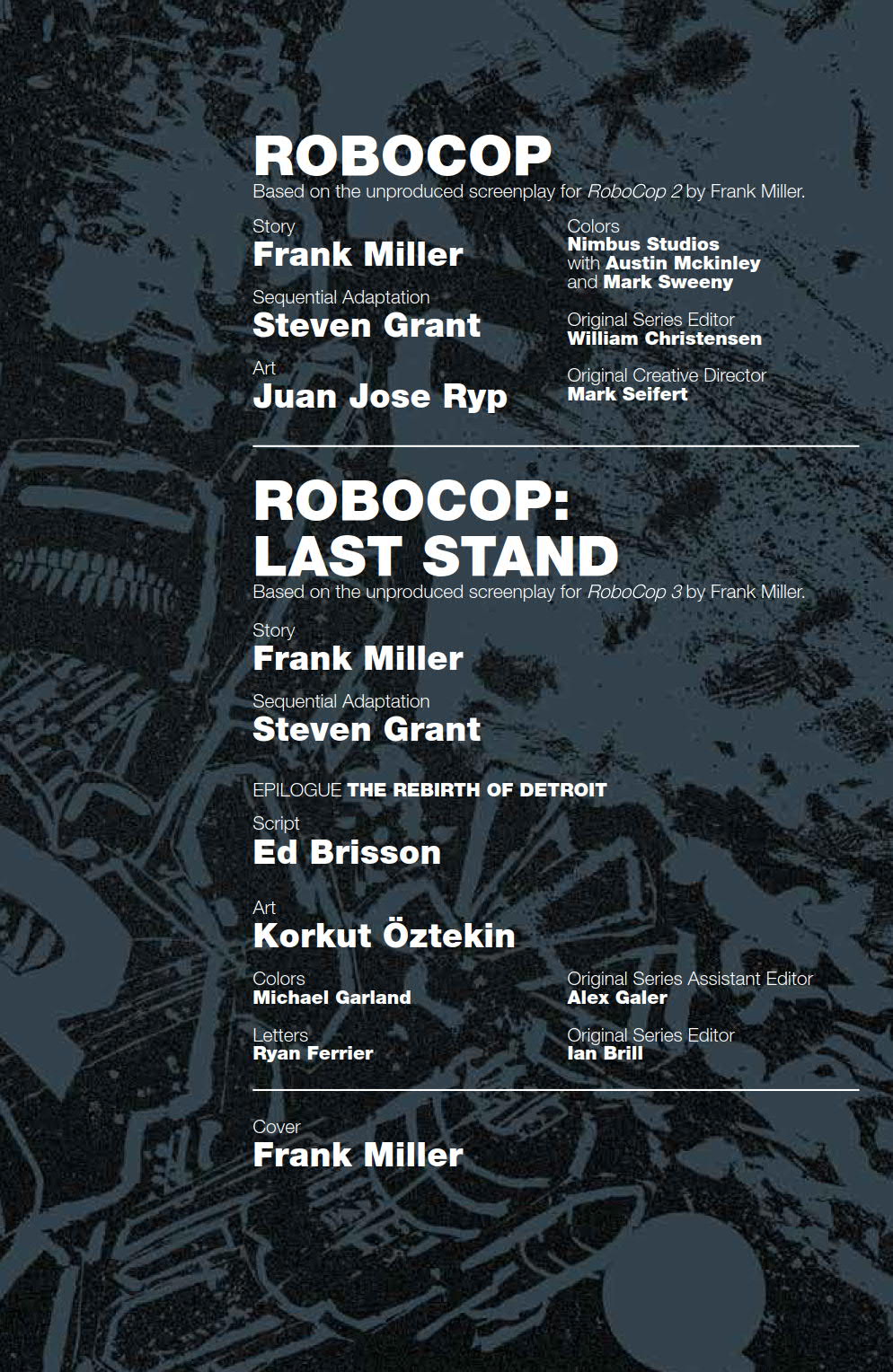 • Included in this omnibus are writer Steven Grant’s (2 Guns) adaptations of the unproduced screenplays for RoboCop 2 and RoboCop 3 originally written by Frank Miller (Sin City, 300).