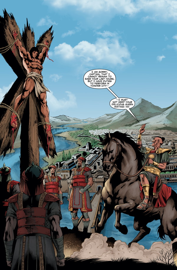 A false queen—the evil twin sister of the rightful ruler—sits on the throne of Khauran. After quashing Conan’s brief rebellion against the impostor, the brutal mercenary leader Constantius orders the Cimmerian to be crucified.