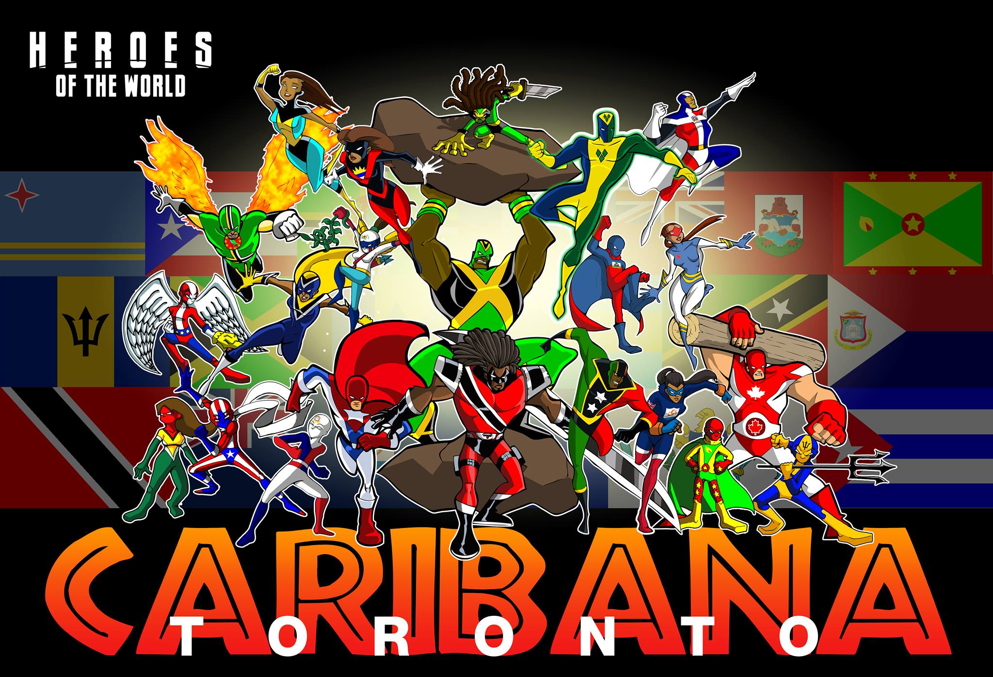 (Joe) Why it was called Heroes of the Caribbean. Starting with Captain Ghana, Mark came over to my place one time saw what I drew and inquired about it. He was pitching me an idea his sister had for us to do artwork at the Caribana parade with these kids wearing hats displaying the different Caribbean flags.