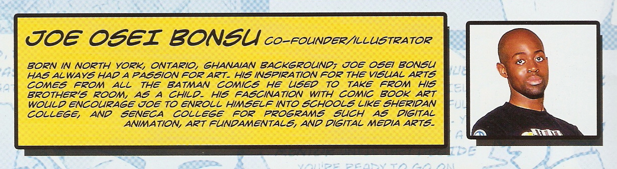 (Joe) I crash landed here from a distant planet. I was found by two Guyanese…NO! That’s BS!! Like Mark, I have this immense passion for comic books and arts and cartoons ever since I was five or six. It even goes further than that, you know what I mean? My brothers and I, we were always glued to our TV watching either MuchMusic or Saturday morning cartoons (Thundercats, G.I. Joe, Masters of the Universe) and that’s what inspired me to draw comic books. I remember as young as four, I would go into my brother’s room and steal his comics, take the books beside me and copy them image per image. My parents saw this and thought best to enrol me in art classes. I think I did those from the time I was eleven, twelve. I just kept with it. In high school, I kept drawing. That’s how I met Mark. He was one of THE GUYS. One of the top artists. I was trying to get where he was.