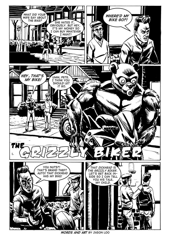 I can’t take all the credit for that. It’s a huge anthology done by thirty other comic creators. J. Bone contributed to both volumes along with Marvin Law. The series was edited by Phil McClorey and Brian Evinou as well as Fearless Fred (he goes by Fred Kennedy). Grizzly Biker came from here. I wanted to create a Toronto character that had a Man-Thing vibe, that tapped into the Marvel horror genre and bring him into my T.O. universe.