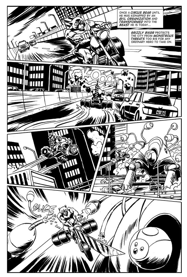 Grizzly Biker has me intrigued. The strong, silent type is a mystery to me. For my benefit, I’m glad you stated the first appearance of this character [MONSTROSITY vol. 1], which now I have to look for. I did see on www.mycomicshop.com the two volumes. They’re quite hefty! Who else has come from your brilliant mind?