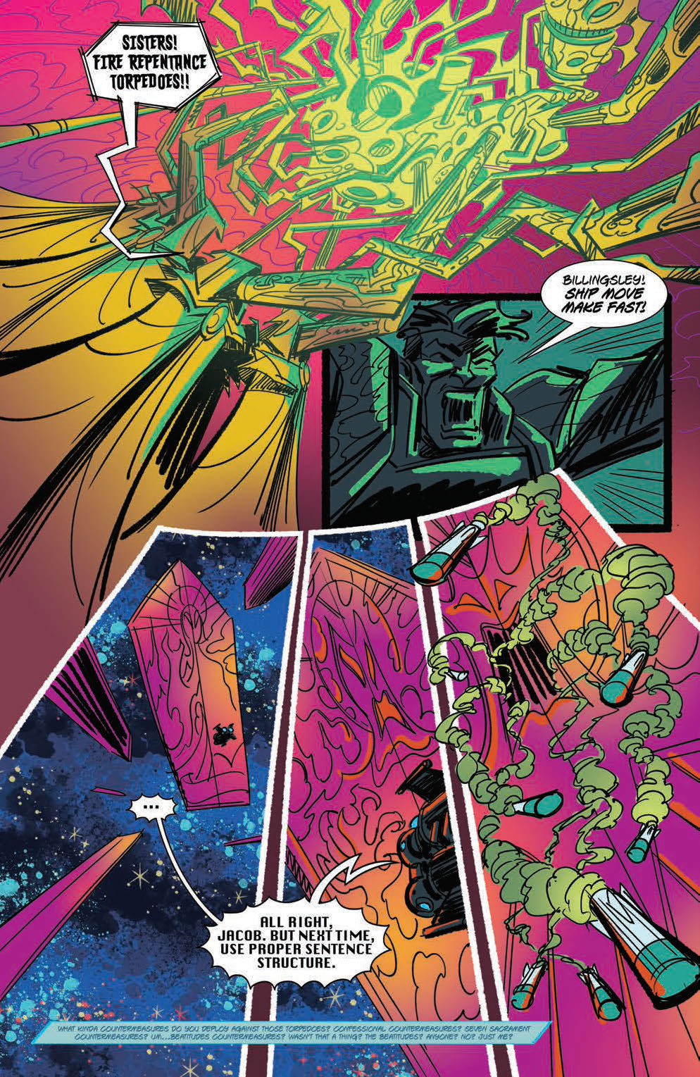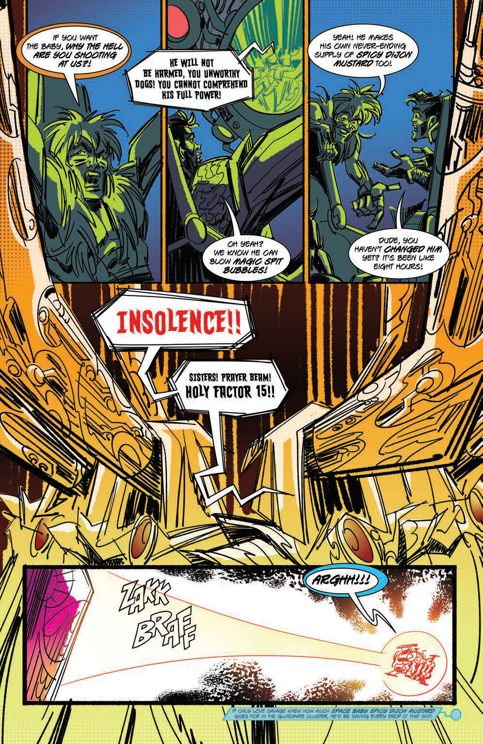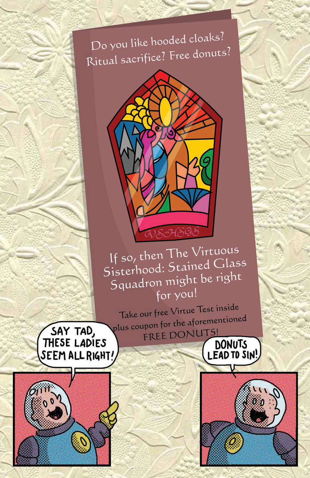Our two men and a baby narrowly escape being converted by The Sisterhood of the Stained Glass Squadron, Love Savage gets his Bi-Bi-Bebar account hacked, the true owners of Roshambo’s Galactic Gauntlets come to collect (hint: they aren’t Etsy users), plus the “real” Tad and Jacob show up and aren’t happy with what The Cosmic Scoundrels have done with their ship (and here Miss Bills was complaining her boys never come to visit)!