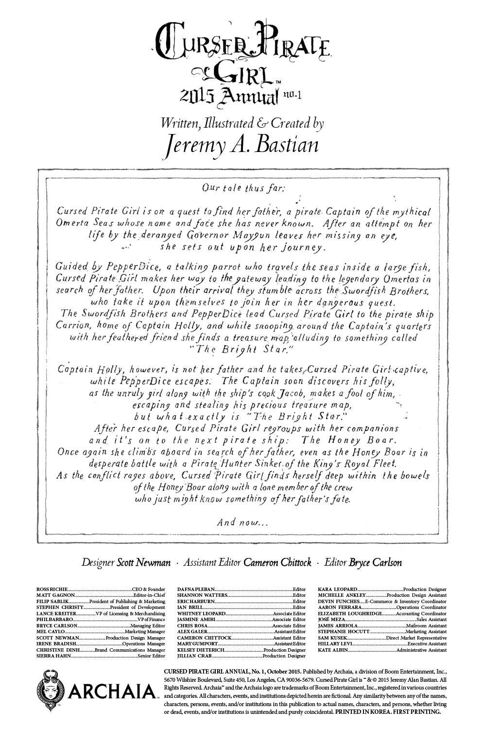 What It Is: The fiery Cursed Pirate Girl and the young Apollonia continue their search for the pirate girl’s father, one of the pirate captains of the dreaded Omerta Seas. This is the first annual installment of Volume 2 of Cursed Pirate Girl, with 54 pages of all-new story, including a gatefold insert.