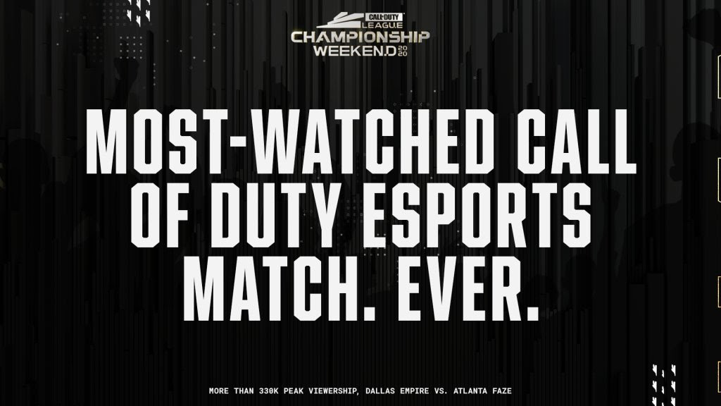 The Championship final between Dallas Empire and Atlanta FaZe reached a peak viewership of over 330K viewers, becoming the most-watched match in Call of Duty esports history.