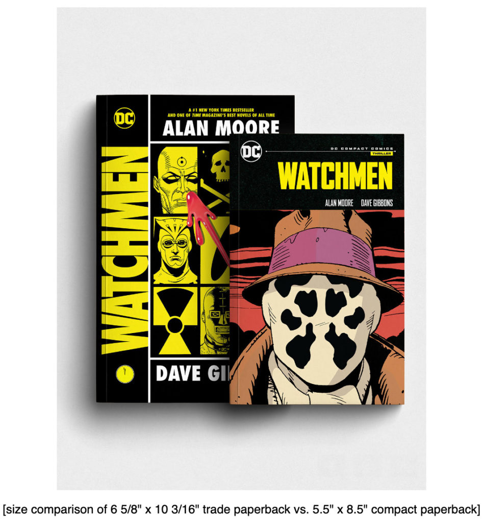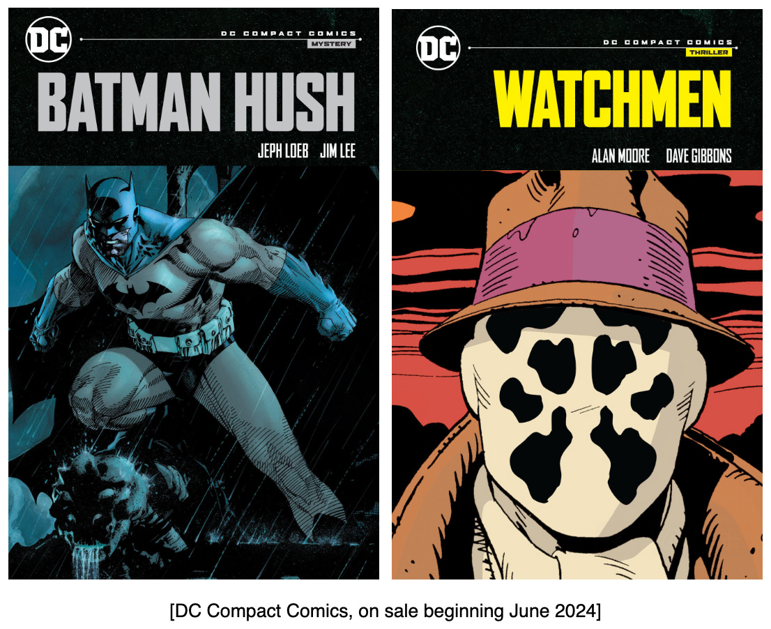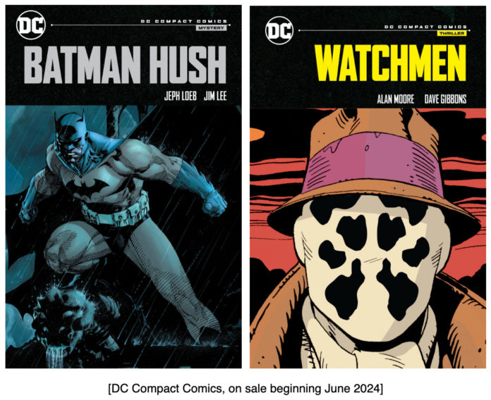 Today, global publisher DC announced a new line in their graphic novel slate: DC Compact Comics. Featuring a 5.5″ x 8.5″ standard book trim for trade paperback novels, the new format pulls bestselling, new-reader-friendly titles from DC’s evergreen library as the first books offered in this new lineup of compact editions of adult graphic novels. Watchmen by Alan Moore and Dave Gibbons and All-Star Superman by Grant Morrison and Frank Quitely, among others, will go on sale beginning in June 2024, retailing at $9.99 US, to launch DC’s new program.