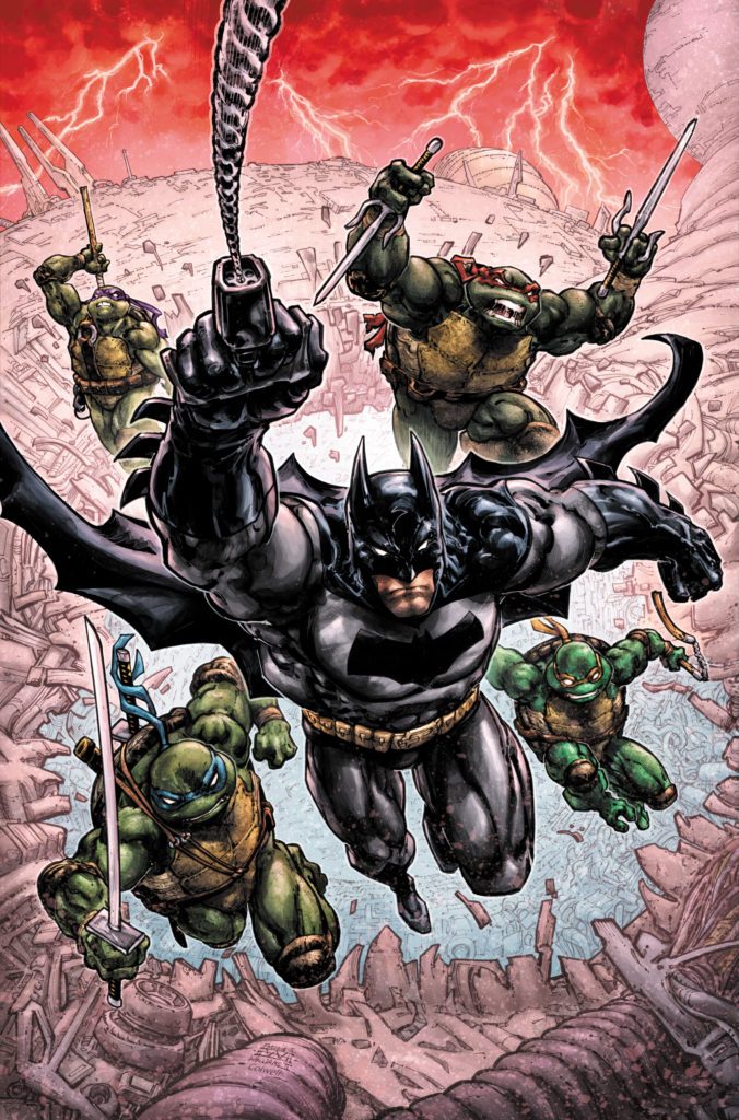 “When I got the call asking if I would be interested in doing some covers for a Batman/TMNT crossover,” added Teenage Mutant Ninja Turtles co-creator Kevin Eastman, “the ten-year-old Batman fan got up and ran around the room screaming at the top of his lungs with excitement…then the fifty-year-old life-long Batman fan did the same thing!”