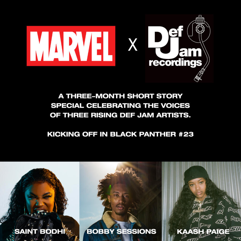 New York, NY— February 17, 2021 — Def Jam Recordings and Marvel Comics – two iconic brands who have left an indelible stamp on popular culture the world over – today announce a special collaboration designed to integrate the voices of young Black creatives with one of the most transformative characters and storylines in graphic arts history: Black Panther. Three of Def Jam’s rising stars – Saint Bodhi, Bobby Sessions, and Kaash Paige – will each contribute character-driven short stories in Black Panther #23, #24, and #25, the last three issues of the “Intergalactic Empire” saga from the acclaimed creative team featuring writer Ta-Nehisi Coates and artist Daniel Acuna.