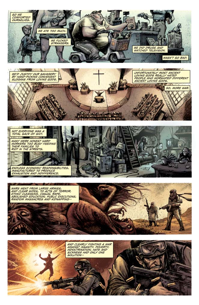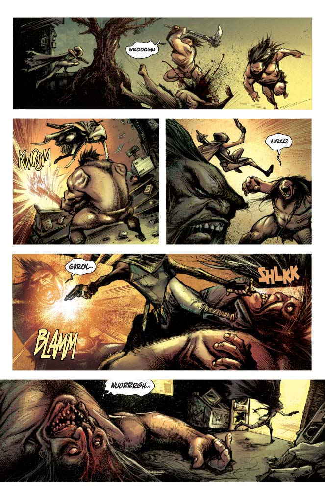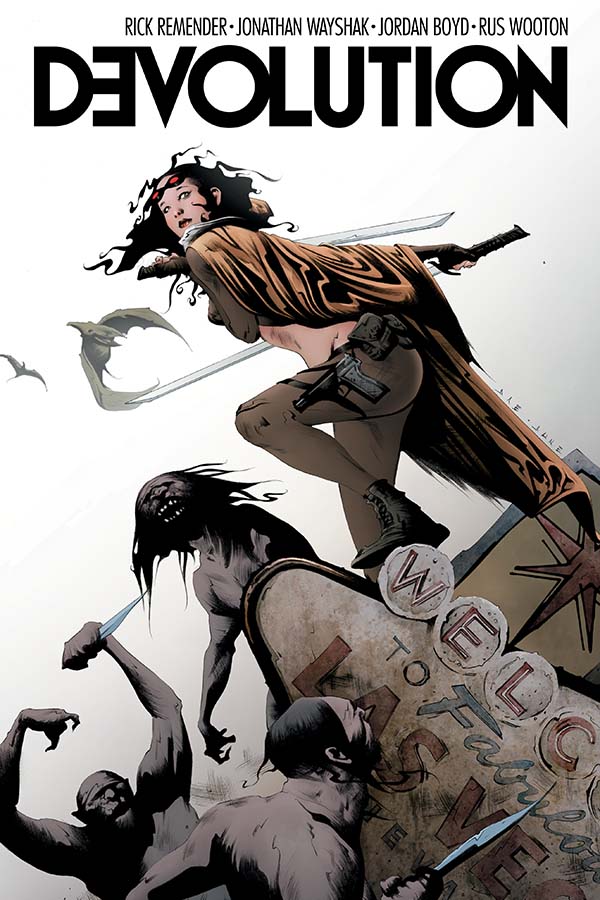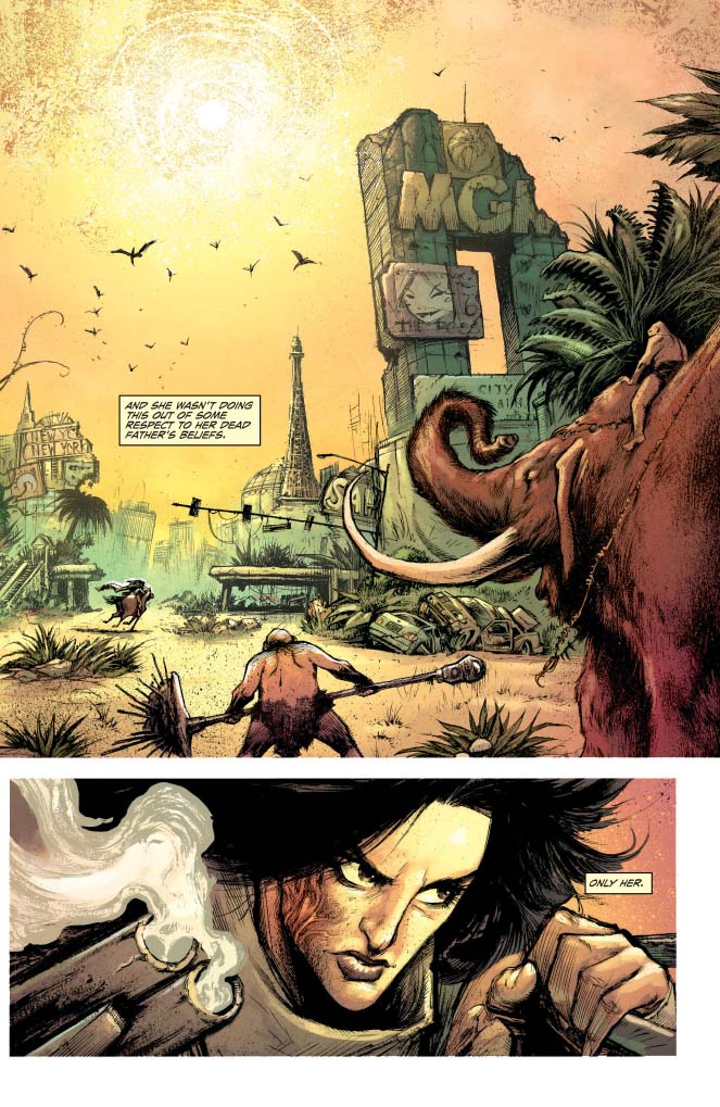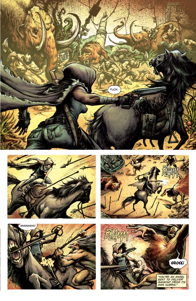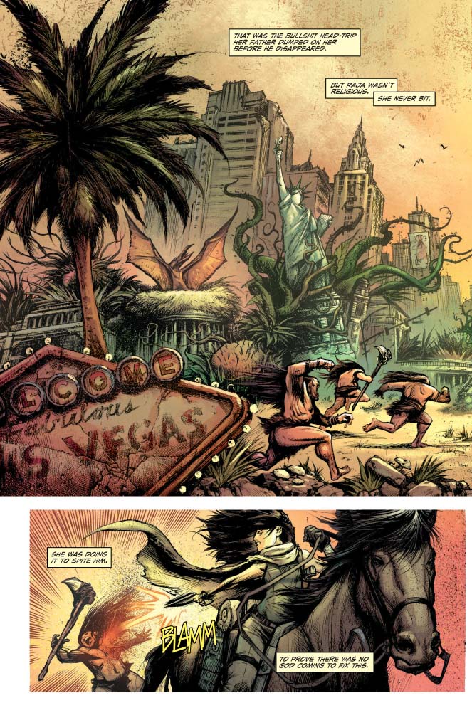 man are little more than bloody territories ruthlessly dominated by tribal Neanderthals ruling from the backs of mammoths, packs of saber-toothed tigers, and giant man-eating insects. Raja, one of the few remaining “Still Sapien” humans, heads to San Francisco to find the antidote for the world-changing DVO-8 viral agent. But to cross the wasteland, she’ll have to convince the last pocket of humanity to join her quest… and survive the Nazi hillbillies that rule them through fear!