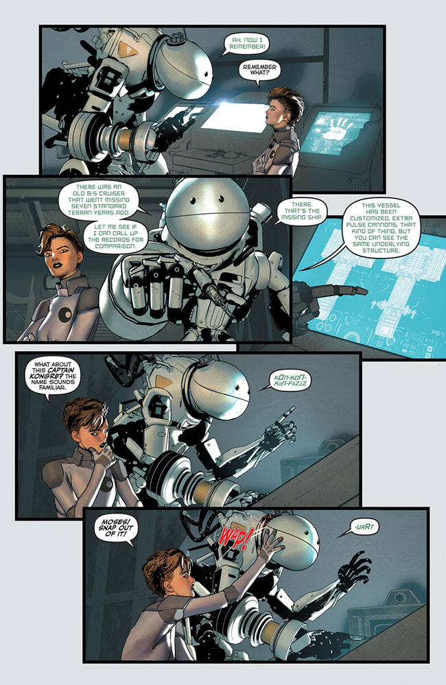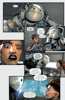 “Brian introduced me to this lesser-known Jules Verne story of dastardly brigands and survival on a lonely, windswept island,” said Hine. “We did the obvious thing and transformed it into an epic science-fiction tale of space piracy, wormholes, galaxy-spanning conflict and a glitchy but lovable robot called Moses.”