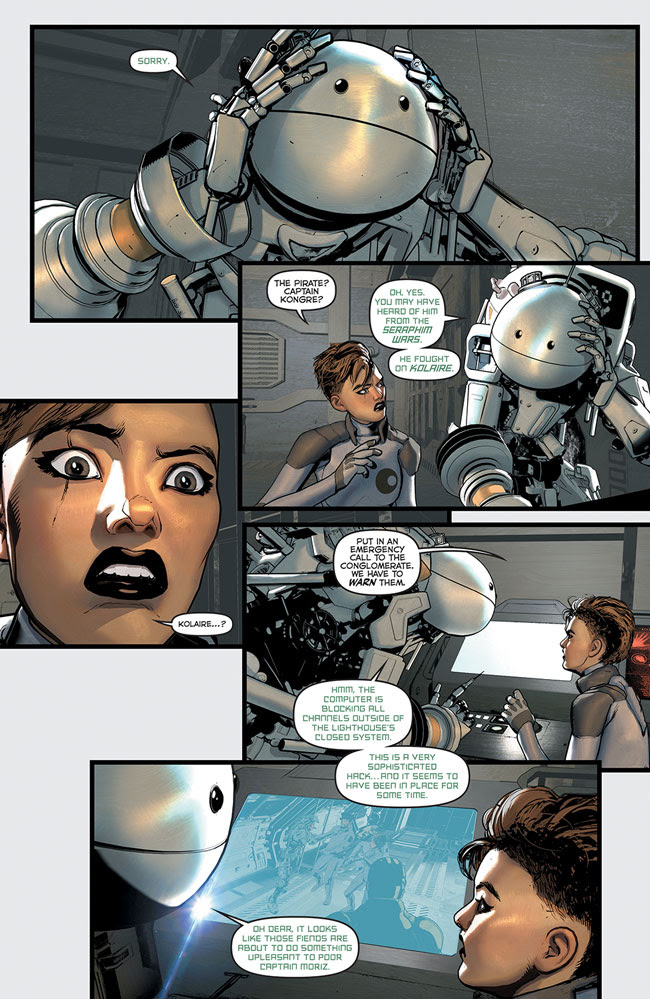 Jules Verne’s: Lighthouse is set at the edge of the galaxy, where there is a giant supercomputer known as the Lighthouse. The only brain powerful enough to navigate ships through a sargasso of naturally occurring wormholes, potentially cutting months or even years off a spaceship’s journey. Three humans, one alien, and a nanny bot have manned the remote station for years in relative peace until the arrival of Captain Kongre and his band of cutthroat pirates threatens the future of civilization and reveals that each of the Lighthouse crew has been hiding a shocking secret.