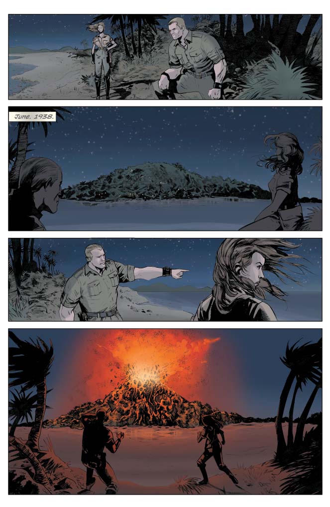 1938: Amelia Earhart is missing, volcanoes are going off under US Navy bases, Silver Death’s Heads are trying to kill Doc Savage, and FDR is quite concerned about all of this. Return to the 1930s for a thrilling four-issue miniseries reuniting the Twilight Zone: The Shadow creative team of writer David Avallone and artist Dave Acosta!  As an added bonus, the Brent Schoonover covers for issues 1-4 will connect to form 1 complete image!