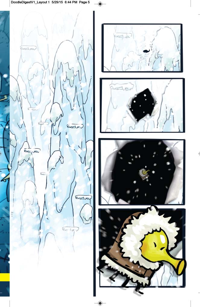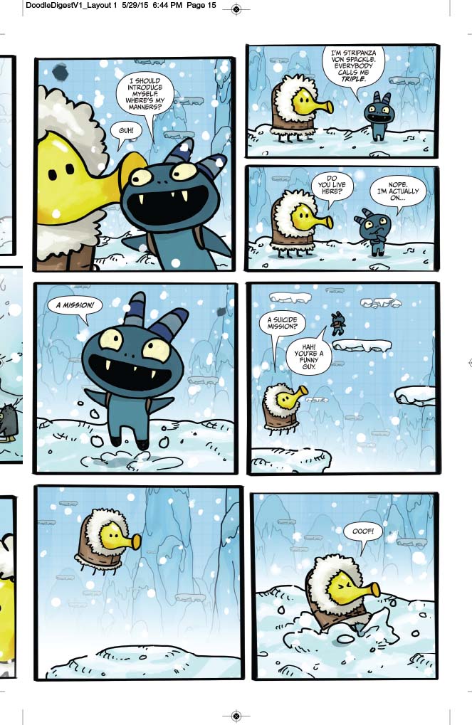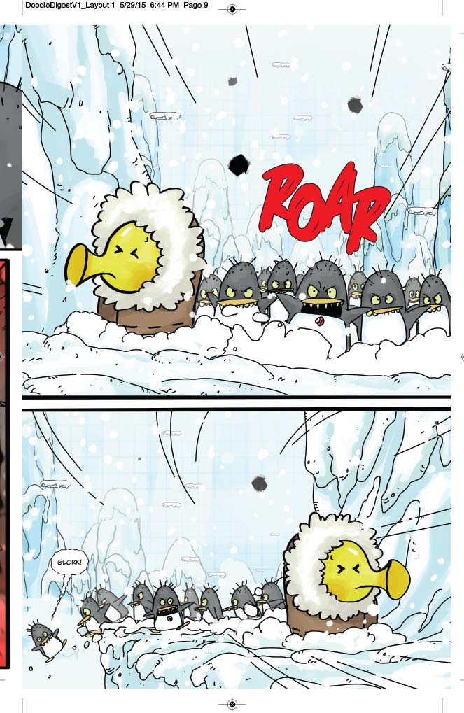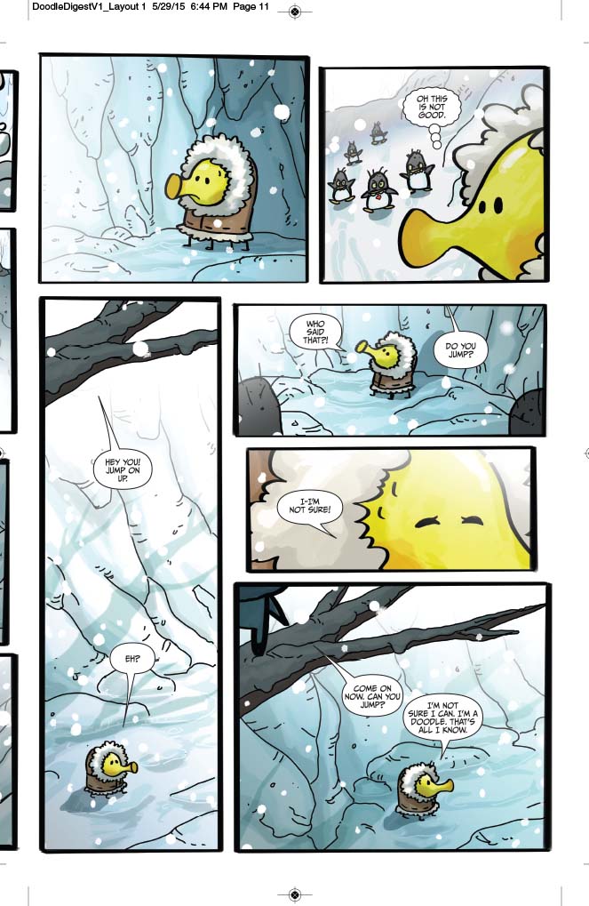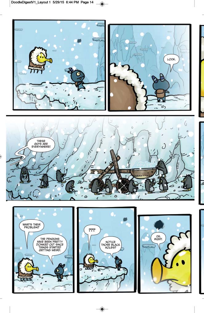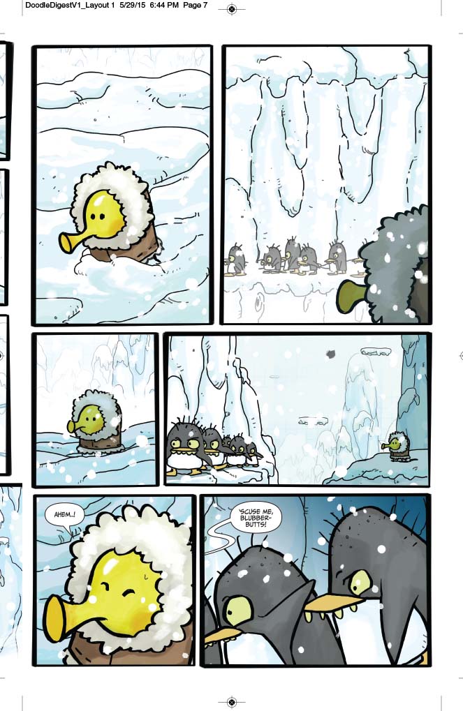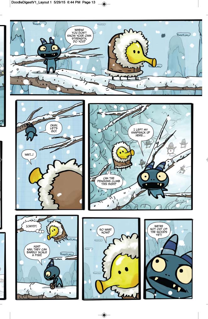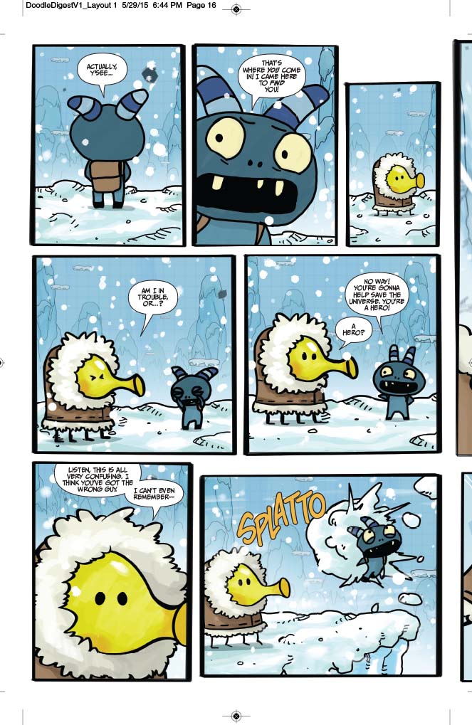 The hugely popular, award-winning game is now a full-color adventure for everyone to read and enjoy! Our jump-inclined hero Doodler has landed in a mysterious wintry world — and an inhospitable one, at that! With the help of an enthusiastic new friend, can he dodge killer penguins and weather the storm? And what destiny lies beyond this frigid wasteland, where Doodler might prove himself a champion against evil ninjas and rampaging robots? Written by Meredith Gran (Adventure Time: Marceline, Scream Queens) with fantastic art by Steve Uy (Avengers Initiative, JSA Classified).