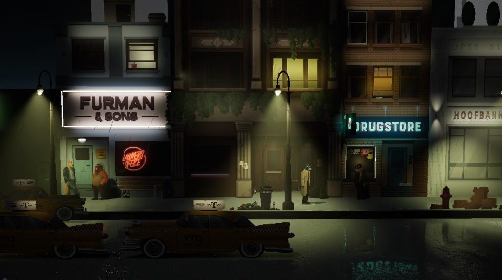 Visually, Backbone is a unique blend of pixel art and 3D effects in Unreal Engine like multi-layered backgrounds, parallaxing, dynamic lighting and lens flares adds to the cinematic feeling of the game. Sprawling city, contrasting silhouettes against the setting sun, dust particles, neon signs and steaming sewer hatches enhance the noir atmosphere of the city.