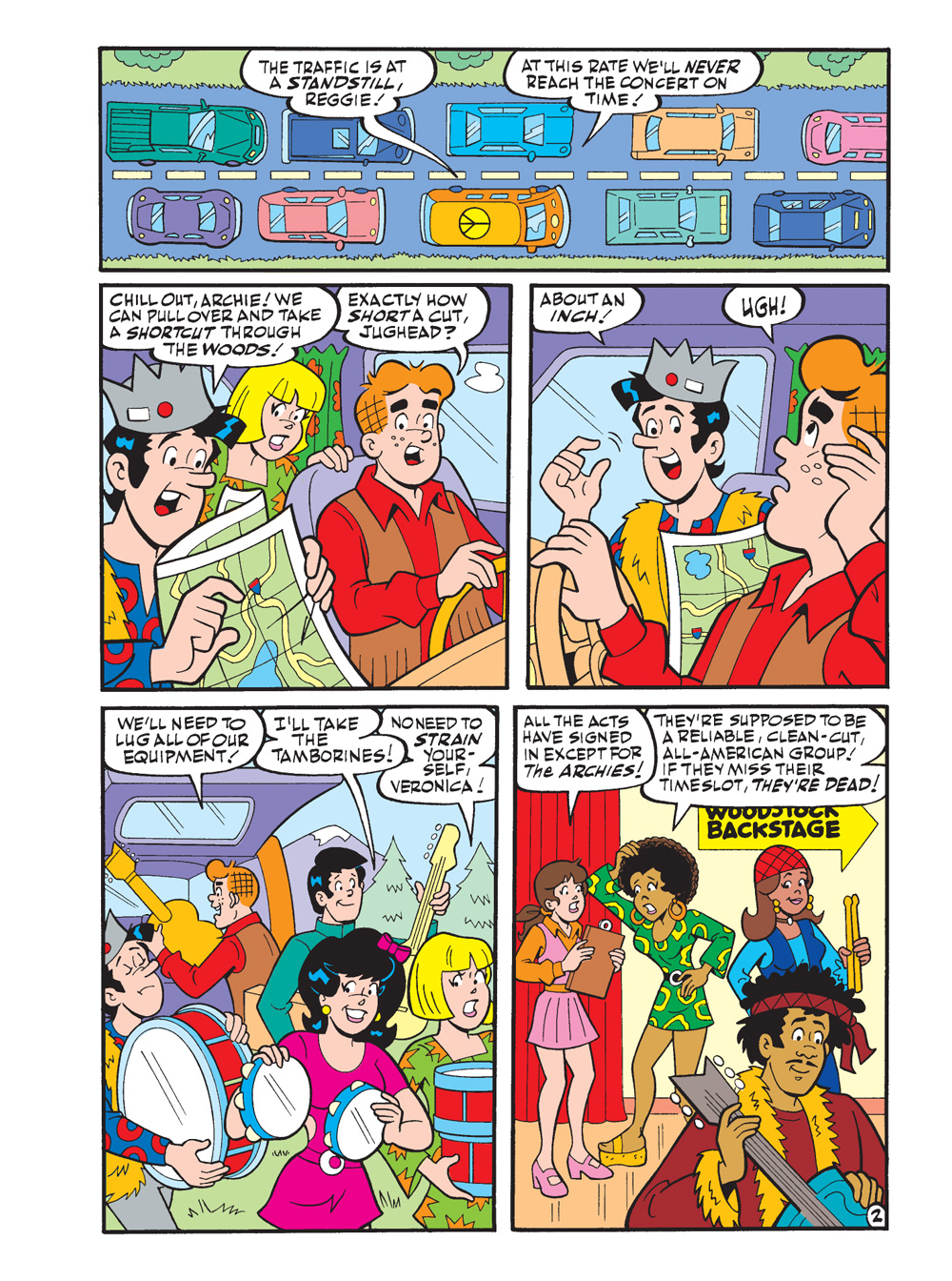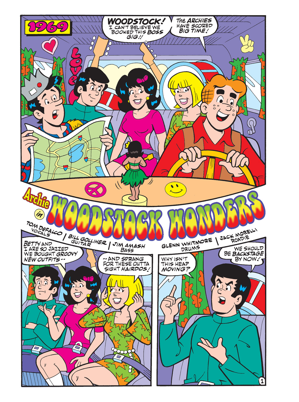 THE ARCHIE MILESTONES DIGEST SERIES RETURNS with a NEW LEAD STORY! In “Woodstock Woes!” The Archies have been invited to appear at the most famous musical event in history—the Woodstock Rock Festival! However, getting there proves to be a problem and they’re worried they’ll be late and miss their time slot! Fortunately, Jughead’s got a plan: they’ll take a shortcut through the woods… what could possibly go wrong?! Then we continue celebrating Archie’s long-lasting legacy of 80+ years of publishing with a special retroactive look at some of the most important eras in Archie’s history! First up: the 1960s, the Silver Age of comics and the decade that brought us the birth of The Archies! Plus, stories from every decade of Archie. There’s something for fans of all ages!