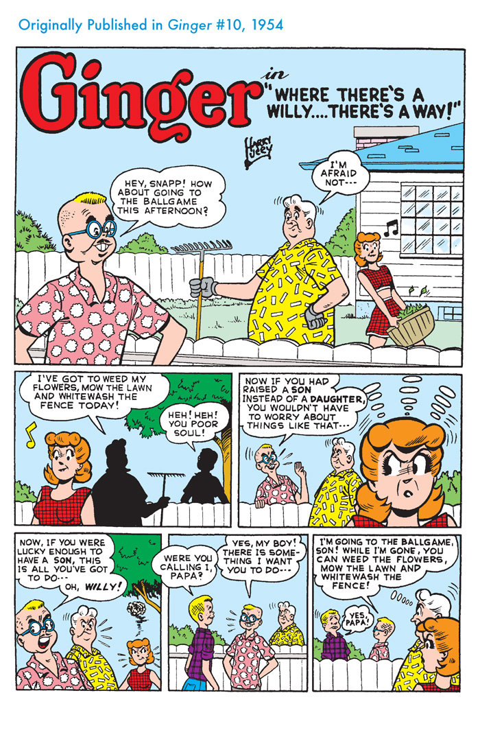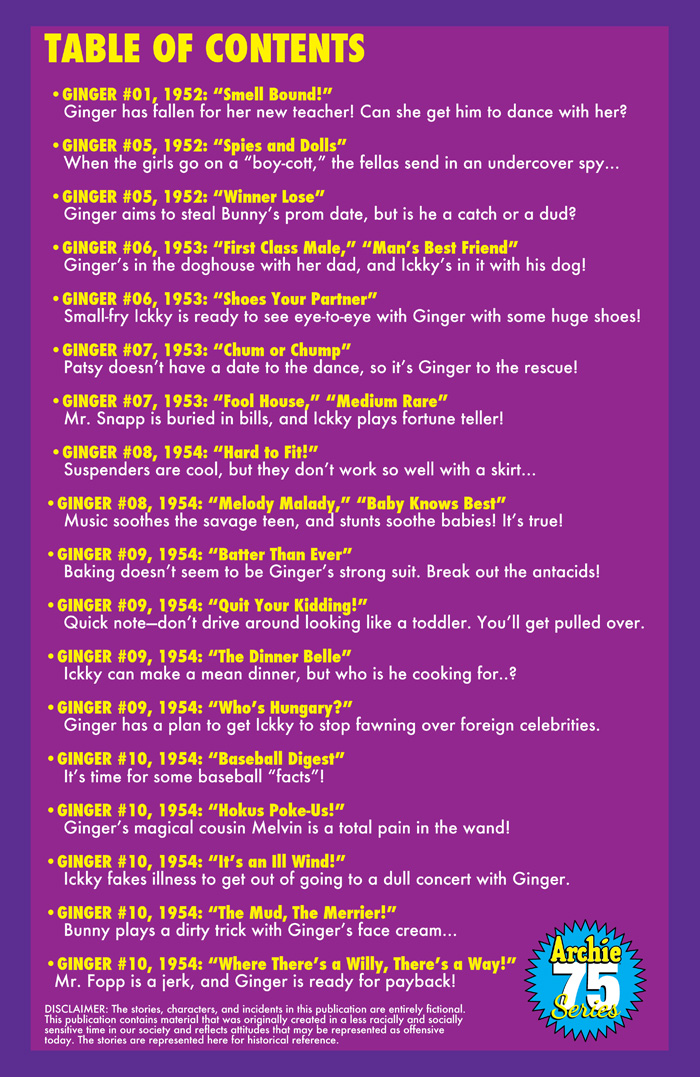Celebrate the 75th anniversary of Archie Comics with this special retrospective presentation! Making her debut WAY back in 1943, Ginger got her own 10-issue series in 1952 after making several guest-star appearances in Zip and Suzie Comics. A fascinating snapshot of the 1950s, Ginger’s wacky antics involve her on-and-off boyfriend Ickky, her grumpy dad, and more! Join us as we present some of the funniest stories from the series, from crazy clothing to school dance disasters!