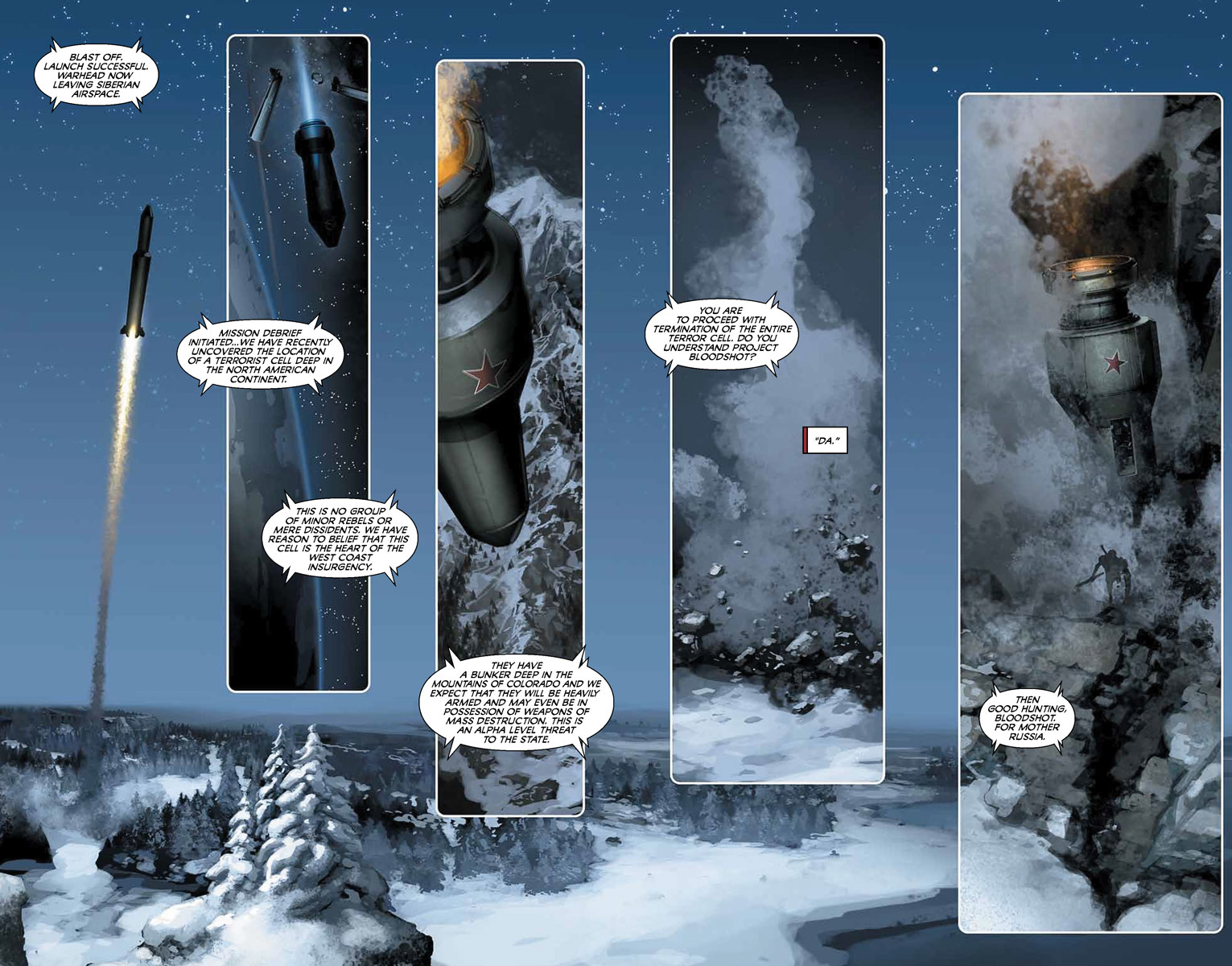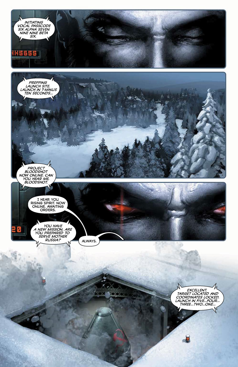 Valiant is proud to present an advance preview of DIVINITY III: KOMANDAR BLOODSHOT #1 – the first of four essential, one-shot specials chronicling the history behind the brave new world that has reordered the Valiant Universe as we know it in the pages of DIVINITY III: STALINVERSE! On December 28th, find out how Valiant’s blood-stained icon marched to the forefront of the global Soviet war machine as New York Times best-selling writer Jeff Lemire (BLOODSHOT REBORN, Death of X) and superstar artist Clayton Crain (4001 A.D.) re-assign the KGB’s deadliest covert operative from Mother Russia to the mountains of Colorado to eliminate a freedom-fighting terror cell charged with spreading the infection of American patriotism!