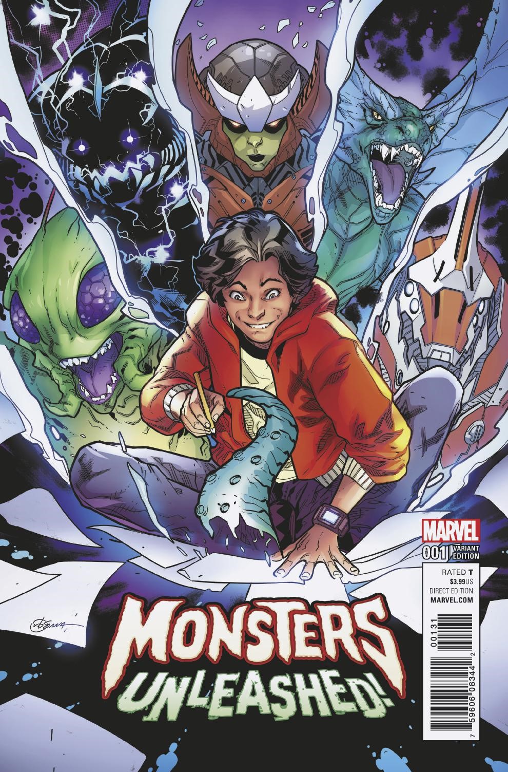 New York, NY—March, 24th 2017 — Spinning out of the blockbuster event series comes the first fabulous issue featuring Marvel’s massive monster do-gooders! Today, Marvel is pleased to present your first look inside MONSTERS UNLEASHED #1 – the new series launching in April from hit writer Cullen Bunn (X-Men Blue, Monsters Unleashed) and fan-favorite artist David Baldeon (Scarlet SpiderMarvel Tsum Tsum)! Smashing their way into the Marvel Universe comes an all-new team of towering monsters looking to protect the planet from disaster! Kid KaijuAegisSlizzikScraggHi-Vo and Mekara are here to spring into action, with a little assist from renowned monster-hunter Elsa Bloodstone! However, can a team of giant monster heroes ever truly be accepted in the Marvel Universe? One thing is for certain – the Avengers, S.H.I.E.L.D., Damage Control and more will be keeping a close watch. Will they be allowed to help, or are they too dangerous to be left unchecked? The massive monster mayhem begins anew on April 19th as Bunn and Baldeon smash their way into your local comic shop for MONSTERS UNLEASHED #1!