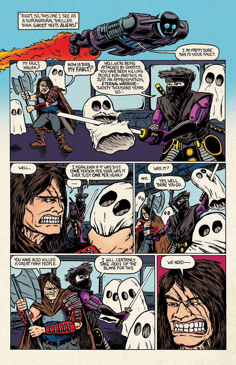 In the wake of BOOK OF DEATH, Valiant’s heavy-hitting superteam is no more…and we’re bidding bon voyage to Unity with a 48-page free-for-all from a gigantic cast of comedy heavyweights!