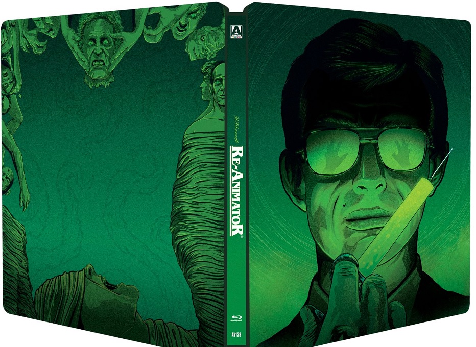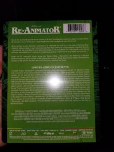 The first thing I wanted to cover was the steelbook itself and it is gorgeous. It has a sickly green painted cover with the image of the good doctor Herbert West on the front. The back is a collage of nightmare fuel showing the severed head of the dean and some mummified bodies. And this piece of artwork was done by the incredibly talented Michael Griffin. This alone is worth the price of admission and would make an excellent addition to your shelf whether you were just wanting the release or getting it for the new sickly green artwork. Not to mention that this is a limited edition of this steelbook so if you want to get one you need to get on that now before these are gone forever!