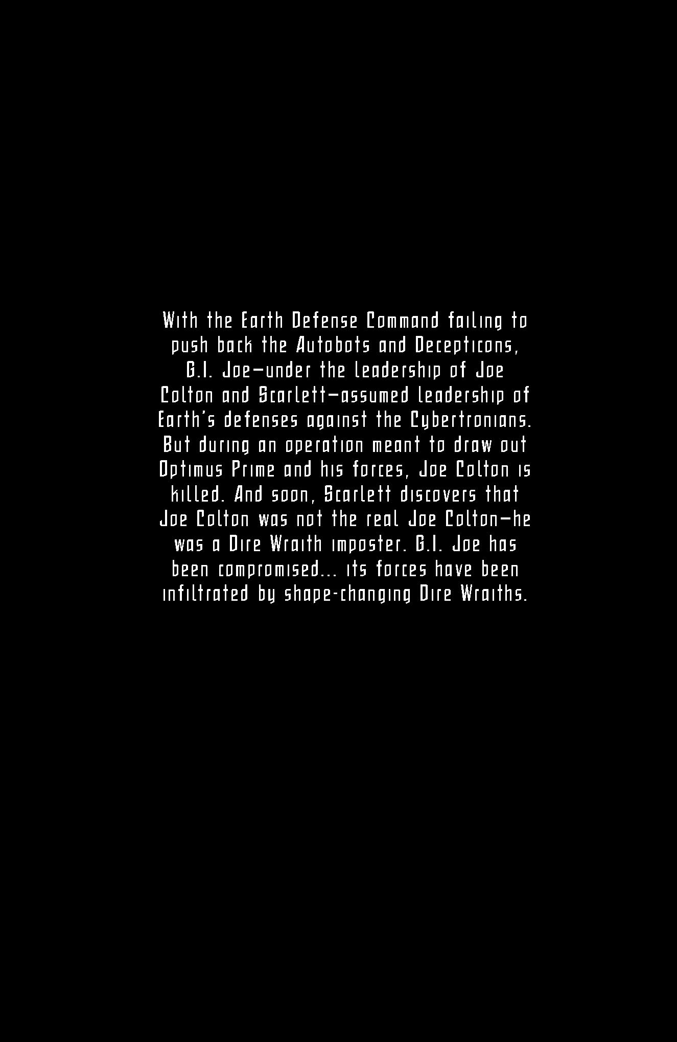 G.I. JOE IS BACK! Thanks to the events of REVOLUTION, the G.I. Joe team led by Scarlett returns to the fray, leading the charge against invading TRANSFORMERS and other aliens. But when a US military defense base goes dark, Scarlett has reason to suspect that these enemy forces may have infiltrated G.I. Joe. It’s up to her, Roadblock, Rock ‘n Roll, Quick Kick, Wild Bill, and Shipwreck to move in and root out any traitors before the facility falls into the wrong hands!
