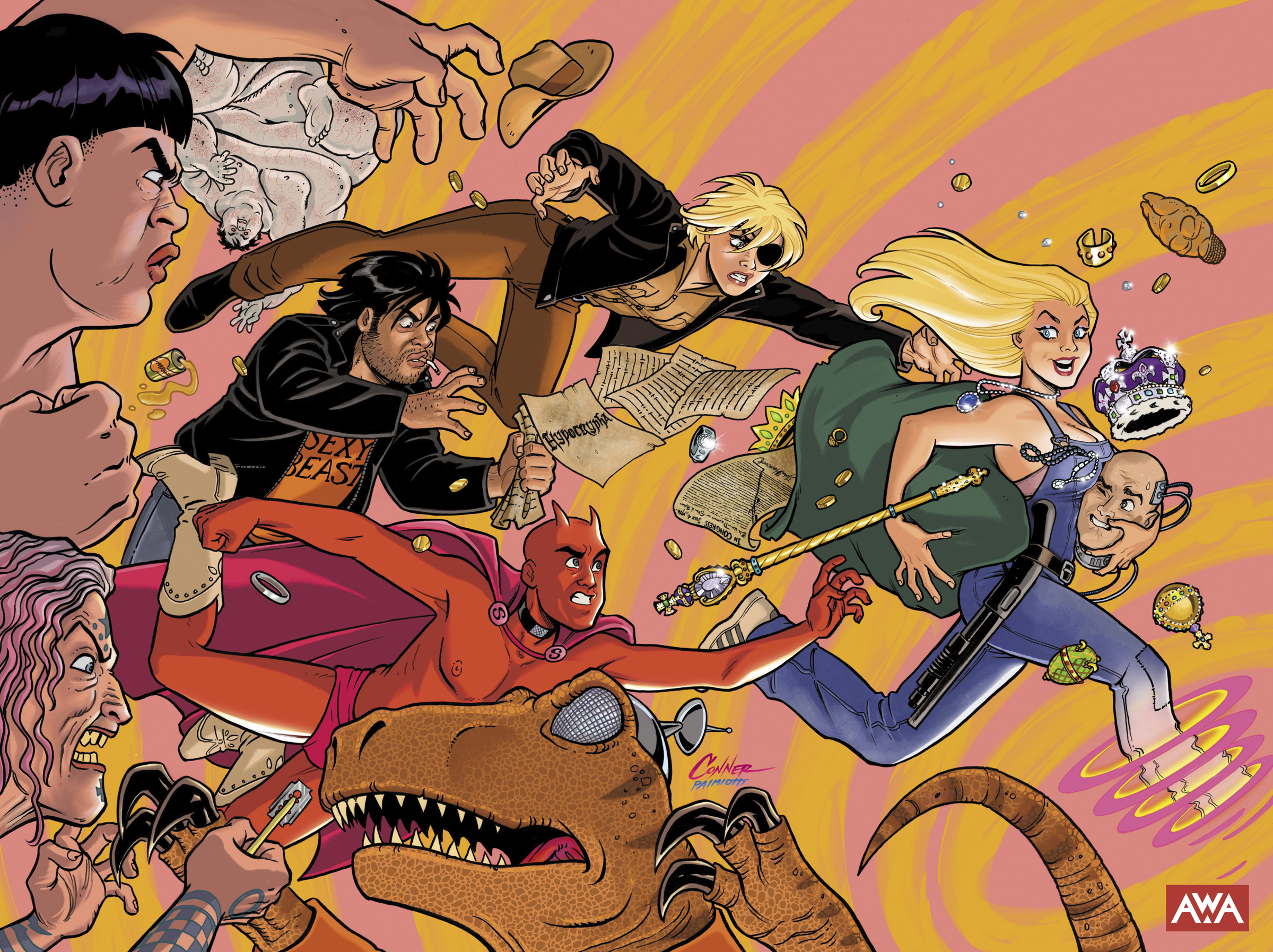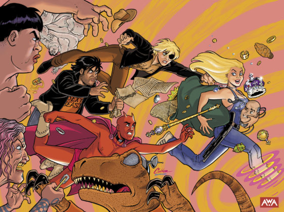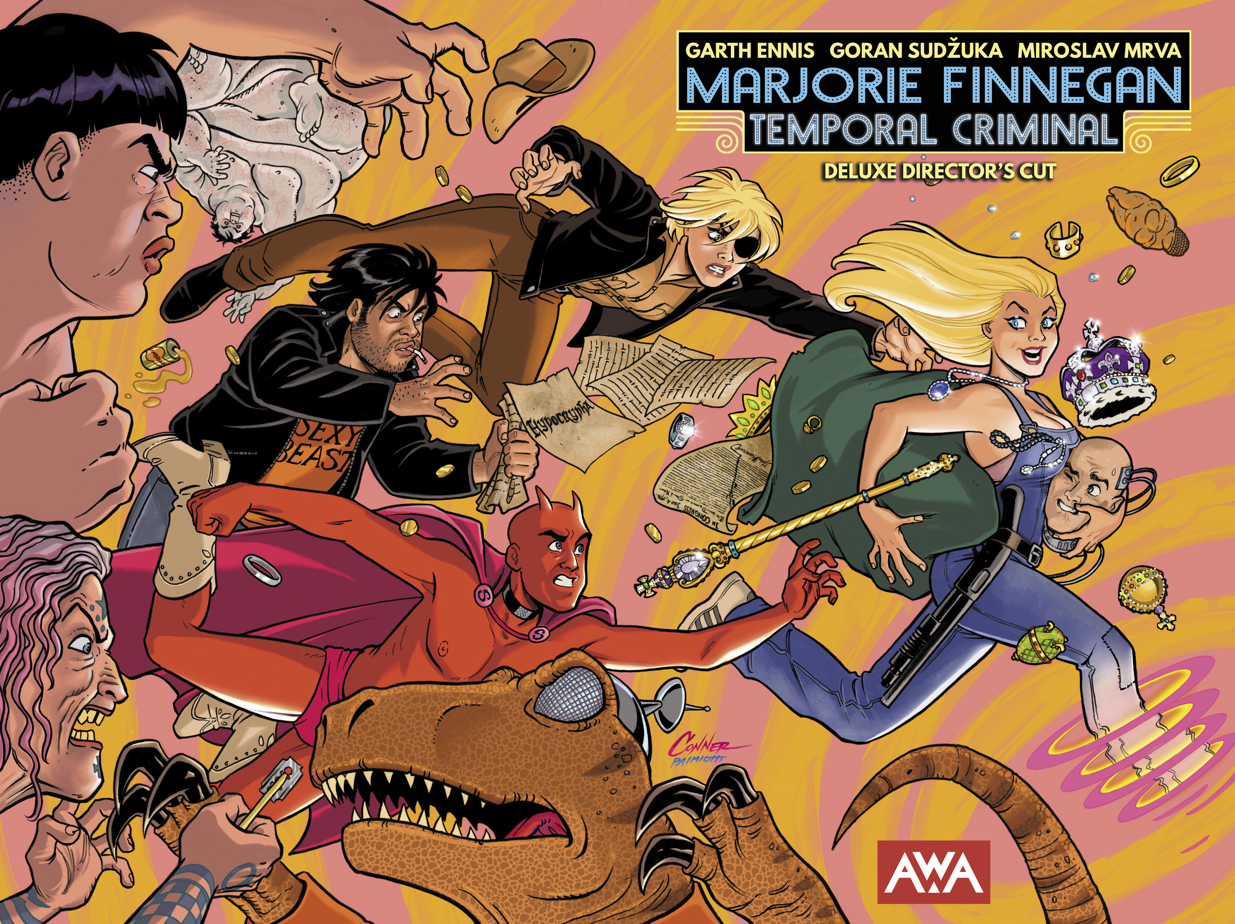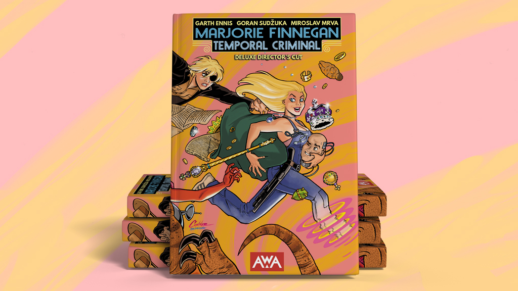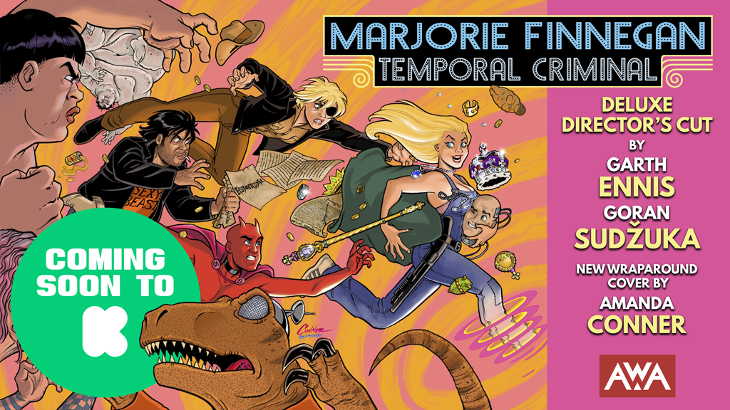 LOS ANGELES, CA – JANUARY 23, 2024, Artists, Writers, and Artisans (AWA), the independent developer of bold, original stories from the world’s most outstanding artists, writers, and artisans, announced today the upcoming Kickstarter campaign giving Garth Ennis fans new ways to celebrate, collect and support the epic time travel heist series, MARJORIE FINNEGAN, TEMPORAL CRIMINAL, via a deluxe director’s cut edition of the fan-favorite series. Penned by National Comics and two-time Eisner award-winning writer Garth Ennis (PREACHER, THE BOYS) with art by Goran Sudžuka (Y: THE LAST MAN, HELLBLAZER: LADY CONSTANTINE) and new wraparound cover art by Amanda Conner (HARLEY QUINN), the Kickstarter exclusive will take readers along for a wild ride in a beautifully crafted collector’s edition of the original series, now with a brand-new 20-page issue of this sci-fi story with time travel elements and a range of new and back matter.