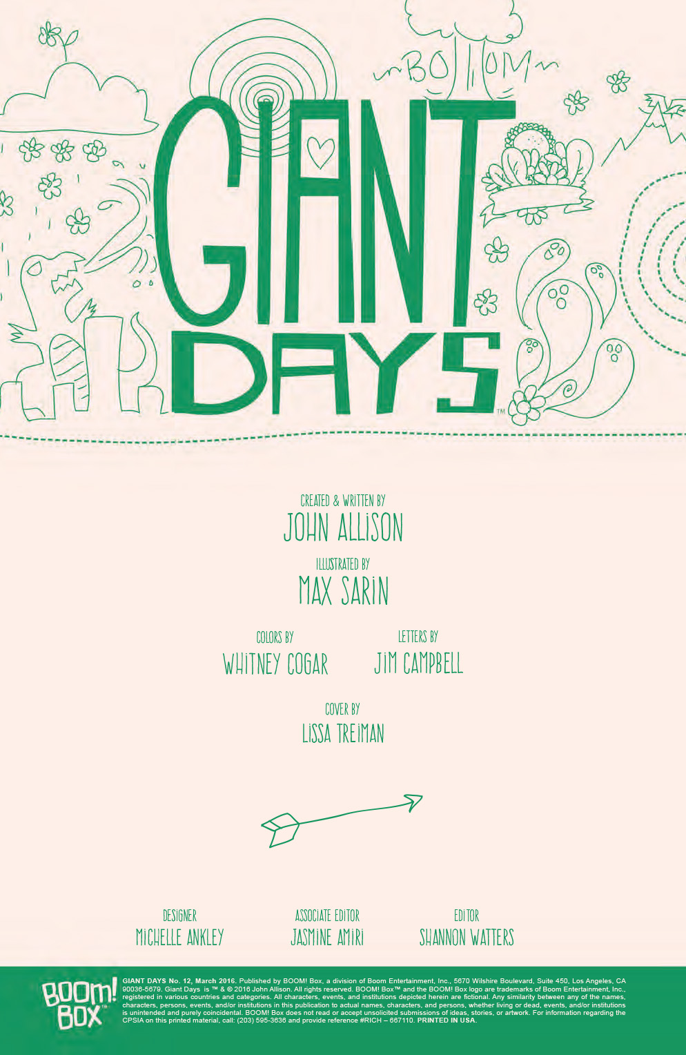 PreviewsBOOM! Box Previews Giant Days #12 By Comix Asylum - Mar 1, 2016 0 861 FacebookTwitterPinterestWhatsApp Giant Days #12 Imprint: BOOM! Box Writer: John Allison Artist: Max Sarin When Esther and Susan get mega bummed-out and are feeling non-jazzed about life, Daisy takes them camping up in the peaks to feel better. Giant Days #12 1 of 7
