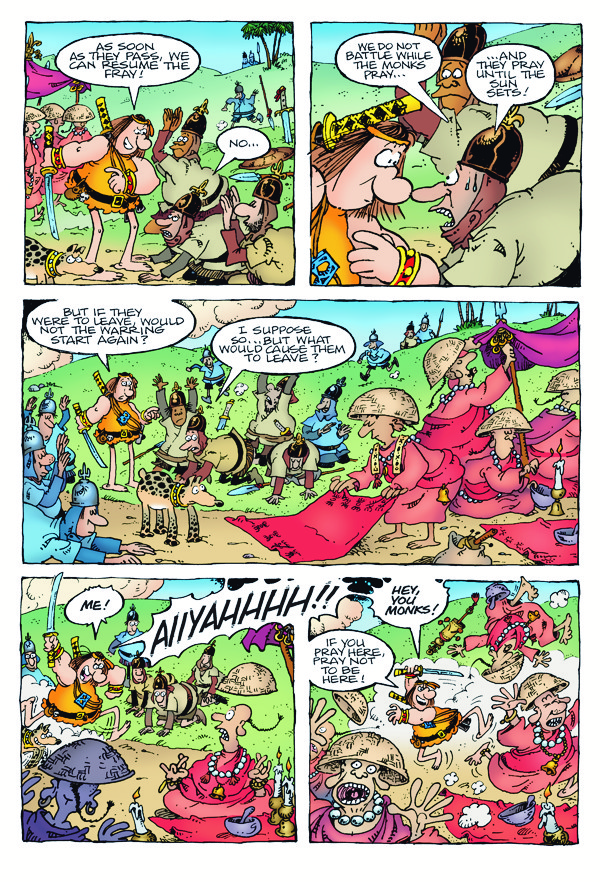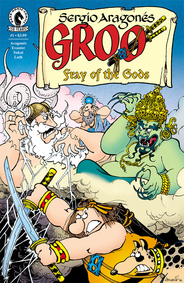 It’s the basis for the new twelve-issue Groo limited series, Groo: Fray of the Gods, featuring a fable told by the same old guys as always: Sergio Aragonés and Mark Evanier, with Tom Luth coloring, and Stan Sakai on the lettering pen.