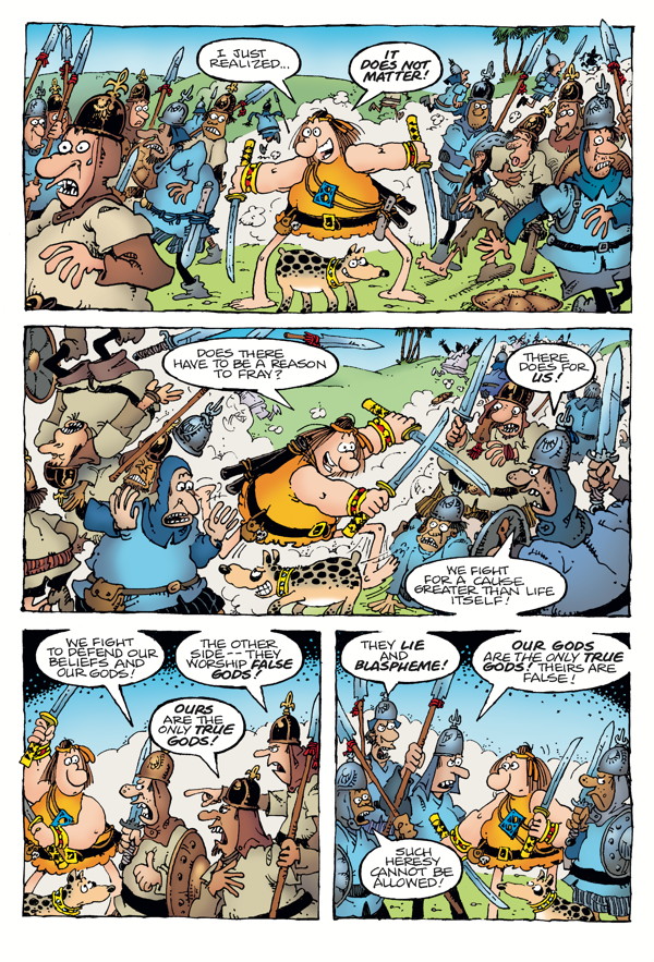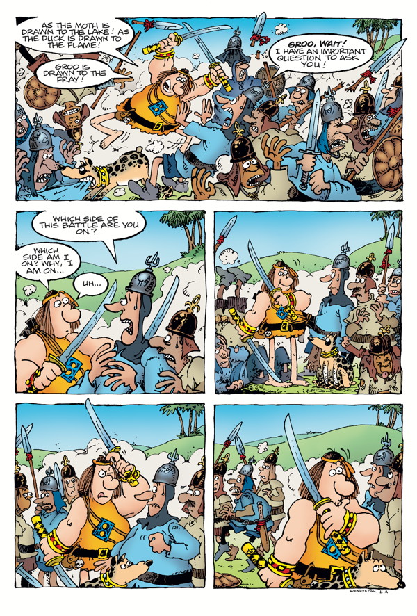 The gods did not bless Groo with brains, only with the ability to battle. Now, they themselves are in conflict over the spirit and future of mankind . . . and it is Groo who becomes the pawn (unwitting, of course) in their war. If the future of humanity depends on the wanderer—we’re all in a lot of trouble.