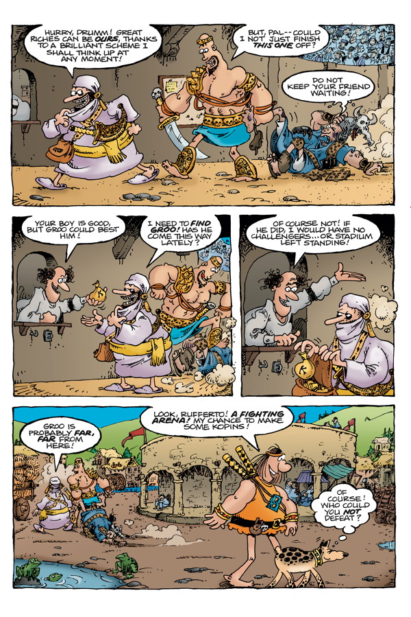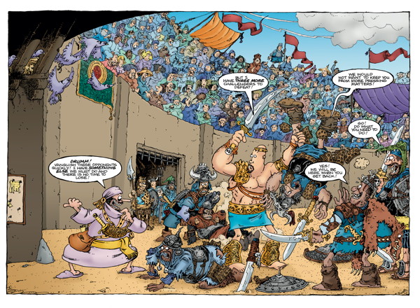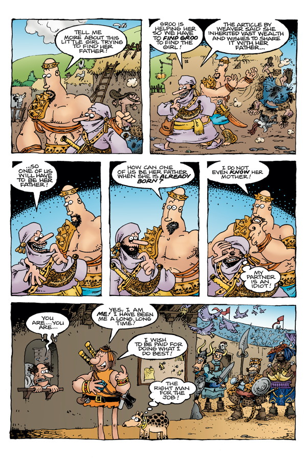 The world’s stupidest warrior encounters two old friends who are most definitely foes: Pal ’n’ Drumm—the greatest of con artists and his sidekick, the world’s second-stupidest warrior. Brought to you, like all Groo comics, by the award-winning duo of Sergio Aragonés and Mark Evanier, with lettering by Stan Sakai and coloring by Michael Atiyeh!