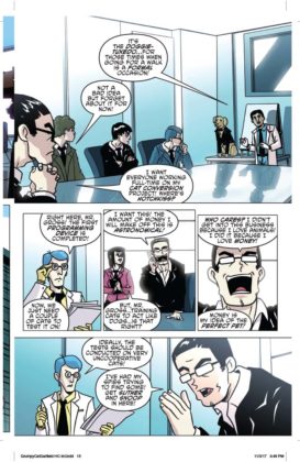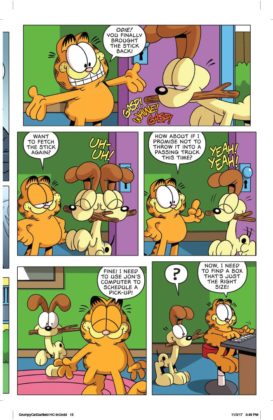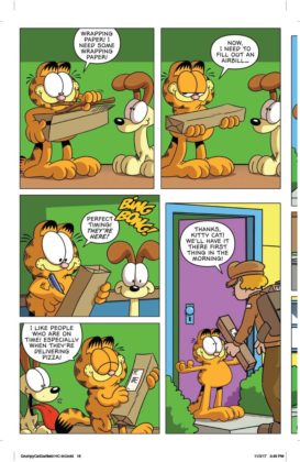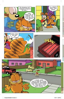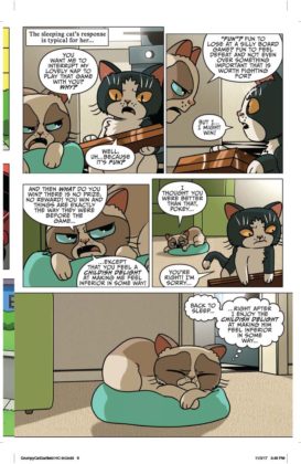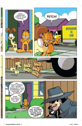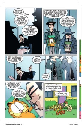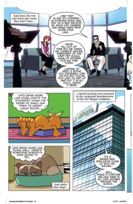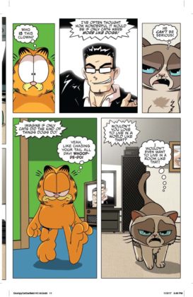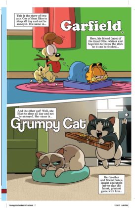It’s the inevitable meeting of the sourpusses! Garfield, the reigning cynical cat of newspapers and TV crosses paths with Grumpy Cat, the internet sensation whose scowl endeared herself to the world. Who’s the most sarcastic? Well, he likes lasagna and not much else…and she doesn’t even like lasagna. Can these two inhabit the same comic book mini-series, let alone the same planet? You’ll find out in a trio of issues written by Mark Evanier and illustrated by Steve Uy. We’d say it’s the cat’s meow but neither of these cats meows.