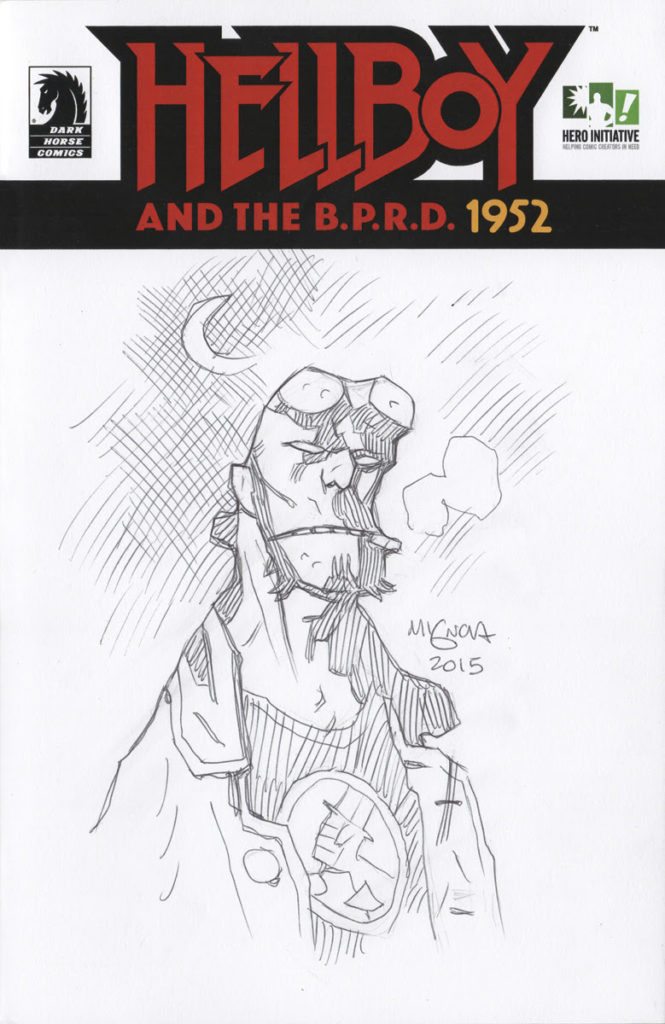 The Hero Initiative, the first-ever federally chartered not-for-profit corporation dedicated strictly to helping comic book creators in need, unveiled its latest project today, The HELLBOY 100, in collaboration with HELLBOY creator Mike Mignola and Dark Horse Comics. To create the HELLBOY 100, Dark Horse Comics printed 100+ blank covers of the landmark first issue of HELLBOY & THE BPRD: 1952, written by Mignola and John Arcudi and featuring the art of Alex Maleev with colors by Dave Stewart. The Hero Initiative then commissioned internationally renowned comic book artists to do an original drawing on each cover, including Gabriel Bá, John Cassaday, Fábio Moon, Eric Powell, Bill Sienkiewicz and Mignola himself. The originals will be auctioned off via eBay.com at the rate of approximately 10 per week for 10 weeks. Both hardcover and softcover editions of a book collecting all the covers will published by Dark Horse Comics in September, 2015.