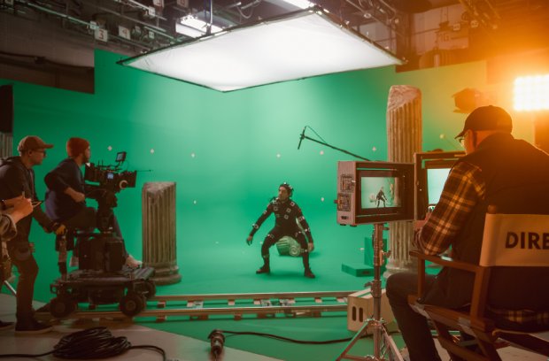 An actor in motion-tracking gear acting against a large green screen background while a production crew films him.