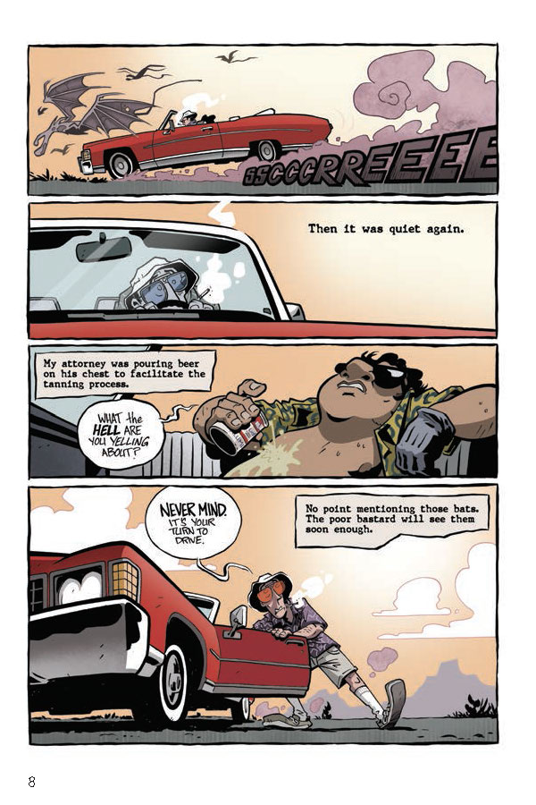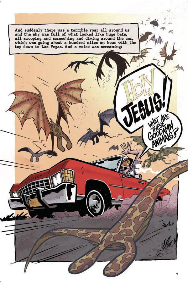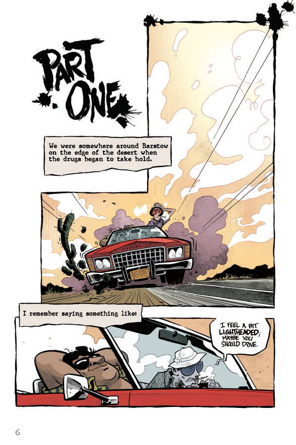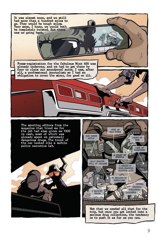 In proud partnership with the Hunter S. Thompson Estate, Top Shelf Productions is pleased to announce Fear and Loathing in Las Vegas, a delightfully bonkers graphic novel by Eisner-nominated artist Troy Little adapting Thompson’s seminal book of the same name. Join Thompson’s alter ego Raoul Duke on the mother of all Vegas benders, as he and his attorney Dr. Gonzo cover a motorcycle race, crash a drug-enforcement convention, and rack up obscenely large room-service bills, all while dosed to the gills on a truly spectacular assortment of mind-altering substances.