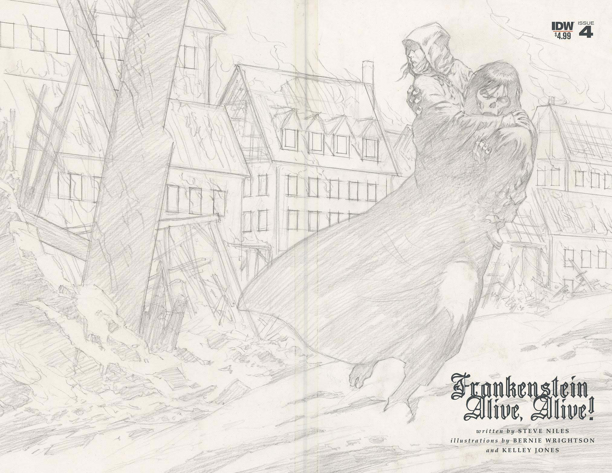 Frankenstein Alive, Alive! meant to be a 4 issue mini-series by Steve Niles and Bernie Wrightson to explore the further adventures of Mary Shelley’s monster. Prior to his tragic passing, Wrightson had completed several pages and laid out the entire final issue. Acclaimed artist Kelley Jones agreed to come on board, work from the layouts, and help complete the series. Issue #4 contains the final pages that Wrightson was able to draw along with Jones’ contribution, and the result flew off the shelves! The second printing will feature a new cover, showcasing an interior double-page spread pencil layout by Wrightson.