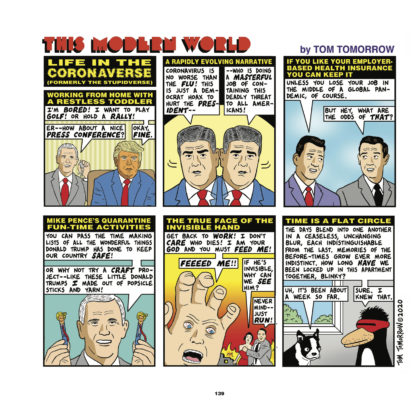 The new volume invites readers to relive the trauma of the last four years with a hilarious (if nightmarish) trip down memory lane. From the Great Inaugural Crowd Size Debate to the nomination of Bret “I Like Beer” Kavanaugh, from Muslim bans to concentration camps, from the Mueller Report to the latest outrageous thing you read about just this morning… Tom Tomorrow covers it all so readers can hide in bed with a blanket over their heads, praying for an asteroid to finally hit the planet.