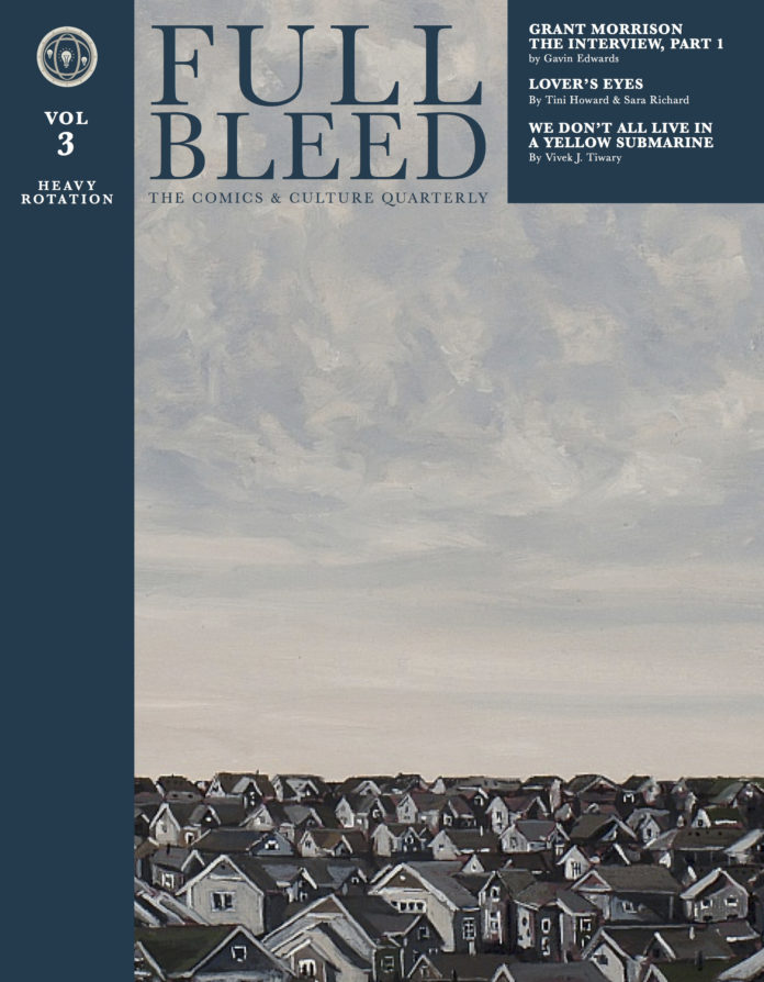 PORTLAND, OR (December 11, 2018) IDW Publishing is launching a Kickstarter for the third volume of FULL BLEED, the acclaimed print-only 200-page hardcover magazine. When funded on Kickstarter, FULL BLEED VOL. 3: HEAVY ROTATION will include a cornucopia of features, including a provocative and long-lost interview with bestselling comic book writer Grant Morrison, discussing his feud with writer Alan Moore; a conversation between music legends Metallica’s Kirk Hammett and Anthrax’s Scott Ian; interviews with with comic book legend Geof Darrow, and contributions by Julia Alekseyeva, Abdulkareem Baba Aminu, Peter Bagge, Tini Howard, Gideon Kendall, Roger Langridge, Joe Lansdale, Erin Nations, Benjamin Percy, Jon Raymond, Sara Richard, Vivek J. Tiwary, Noah Van Sciver; Shannon Wheeler, and many more.