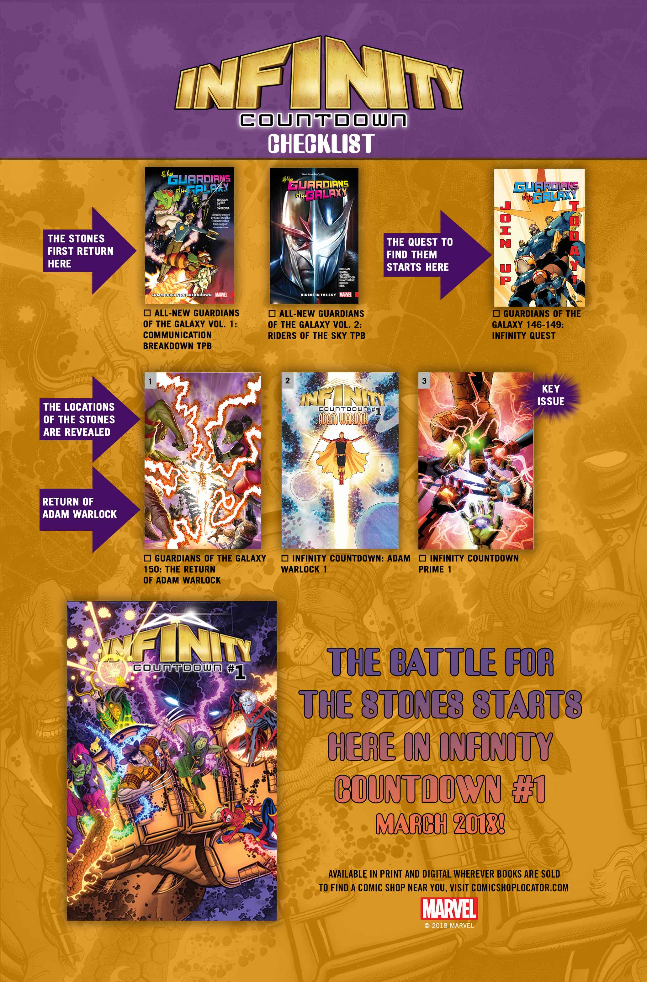 Serving as a handy map and designed to help guide readers towards key Marvel issues that have played a role in preparing the Marvel Universe for this epic saga, the INFINITY COUNTDOWN checklist ties it all together – from the first reappearance of the Infinity Stones in ALL-NEW GUARDIANS OF THE GALAXY to the upcoming INFINITY COUNTDOWN PRIME #1. And fans can download this digital checklist to whatever device they choose, placing it right at their fingertips for easy access! (Retailers can find a file on the Diamond retailer page.)
