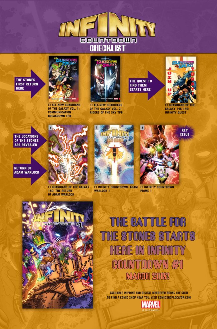 Serving as a handy map and designed to help guide readers towards key Marvel issues that have played a role in preparing the Marvel Universe for this epic saga, the INFINITY COUNTDOWN checklist ties it all together – from the first reappearance of the Infinity Stones in ALL-NEW GUARDIANS OF THE GALAXY to the upcoming INFINITY COUNTDOWN PRIME #1. And fans can download this digital checklist to whatever device they choose, placing it right at their fingertips for easy access! (Retailers can find a file on the Diamond retailer page.)
