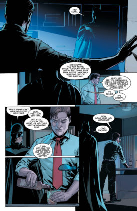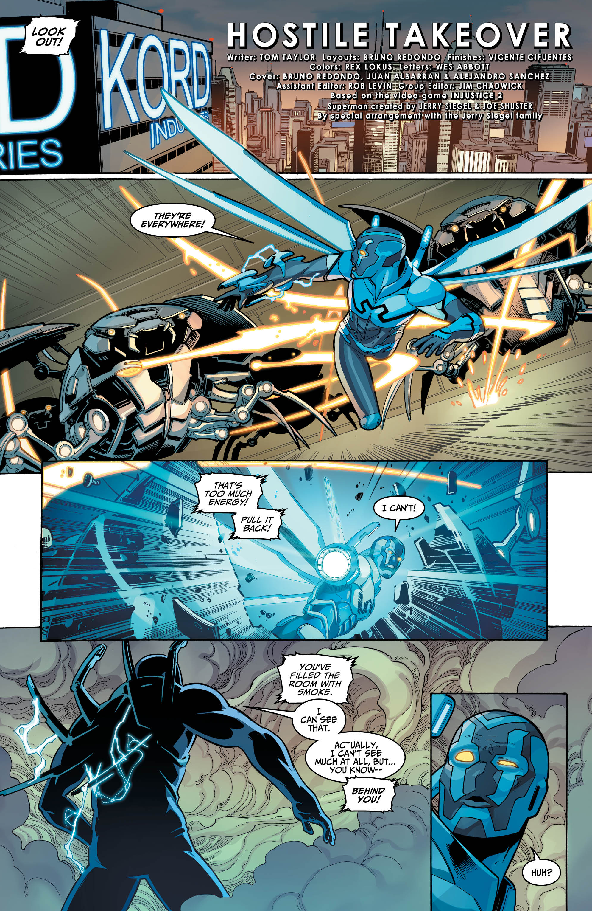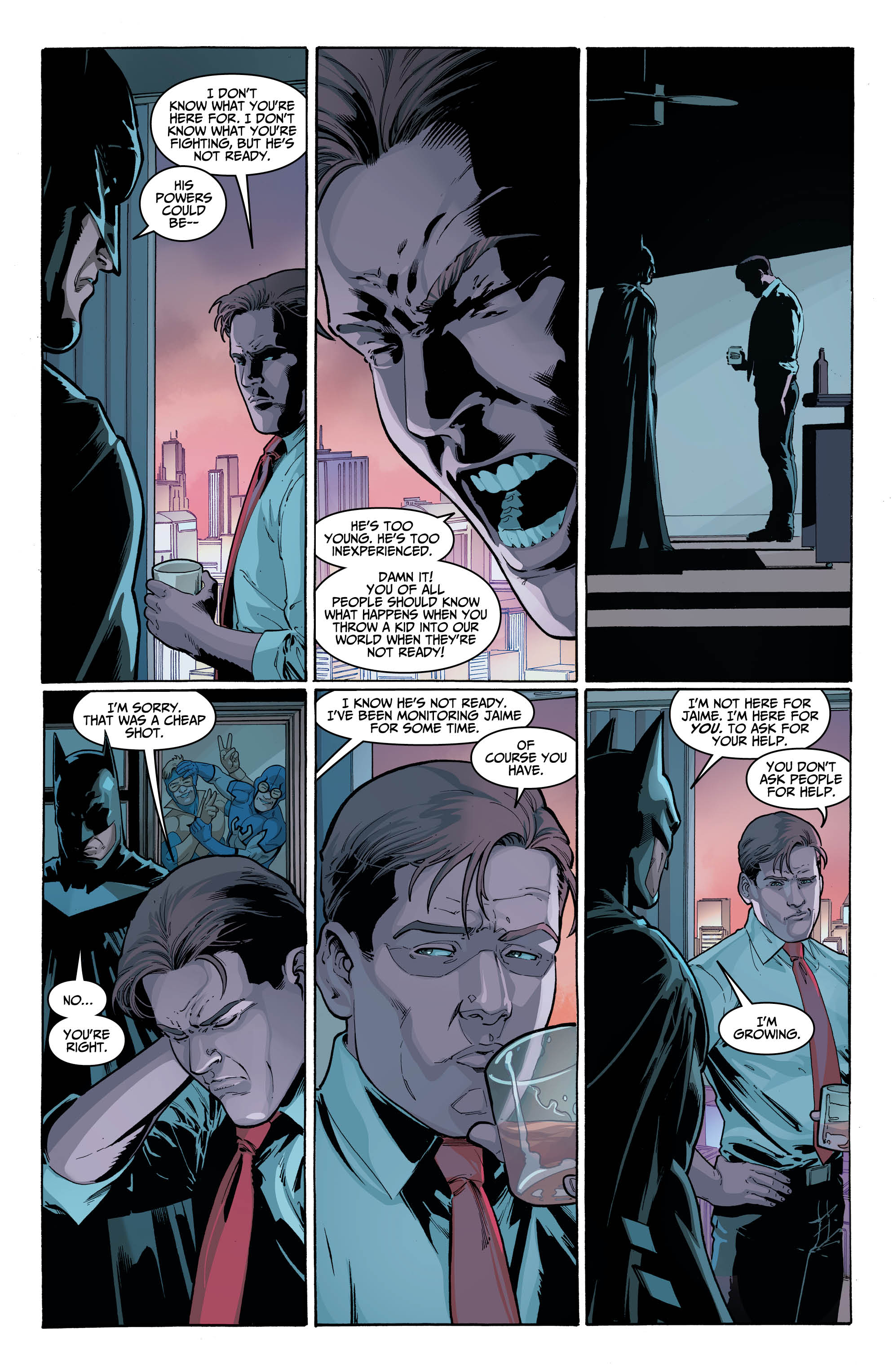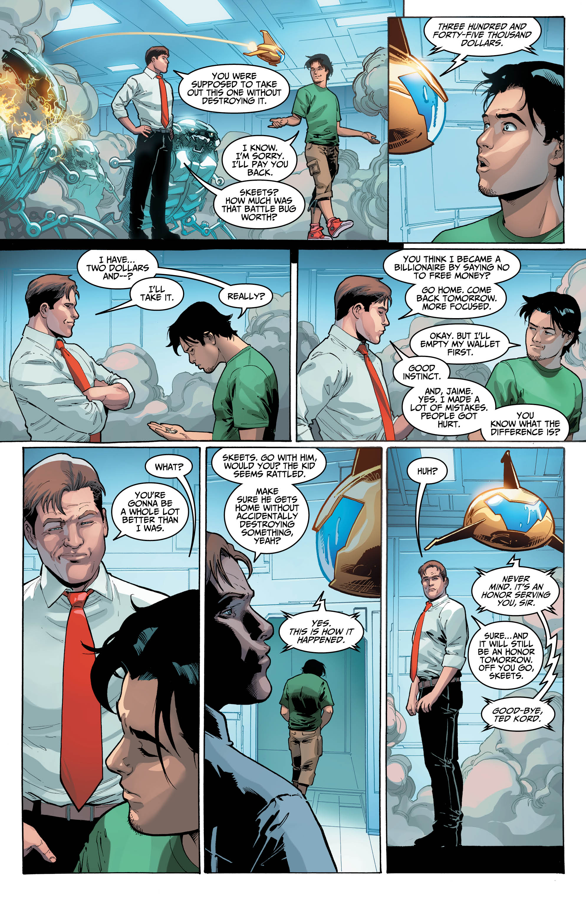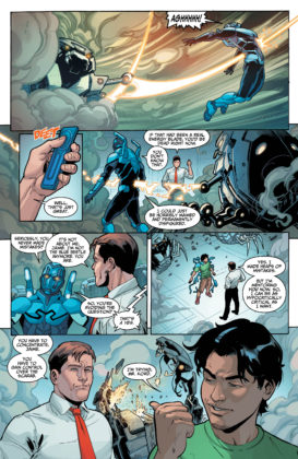 Batman pays a visit to Ted Kord, beseeching him to become part of the team that rebuilds the world – not as Blue Beetle, but as Ted Kord, inventor and industrialist. But Batman’s not the only on who has designs on Ted. A trusted old friend pops in, as does someone else – someone with less noble intentions.