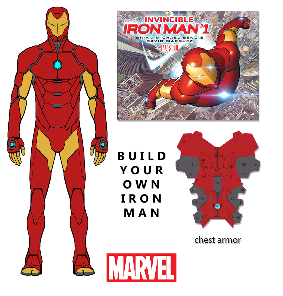 Launching alongside INVINICIBLE IRON MAN #1, the first piece of the BUILD YOUR OWN IRON MAN promotional item will allow fans to assemble their very own Iron Man armor. Based on artist David Marquez’s new armor design, collect all six pieces, launching alongside Invincible Iron Man and five other October Marvel titles, fold and compile your very own Iron Man standing nearly a foot tall!