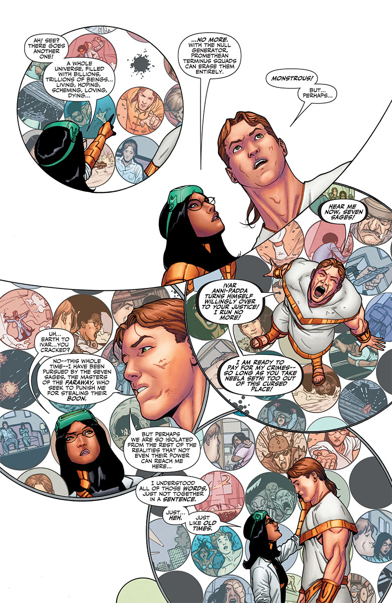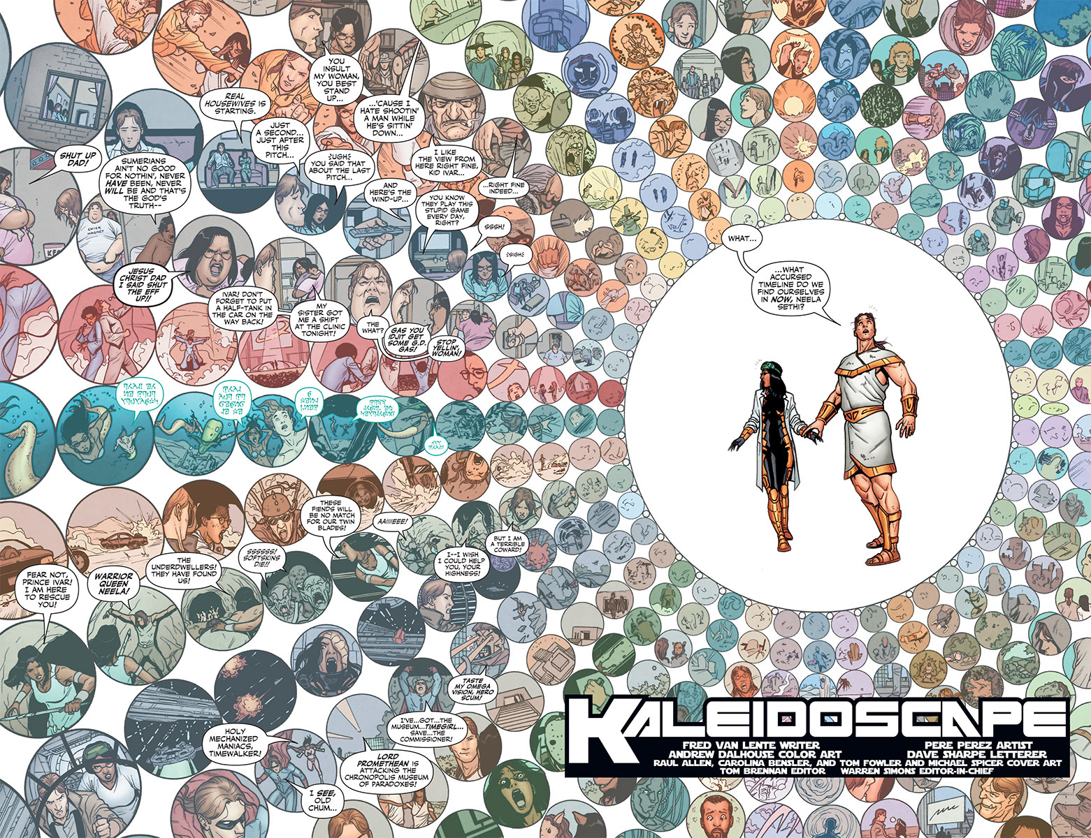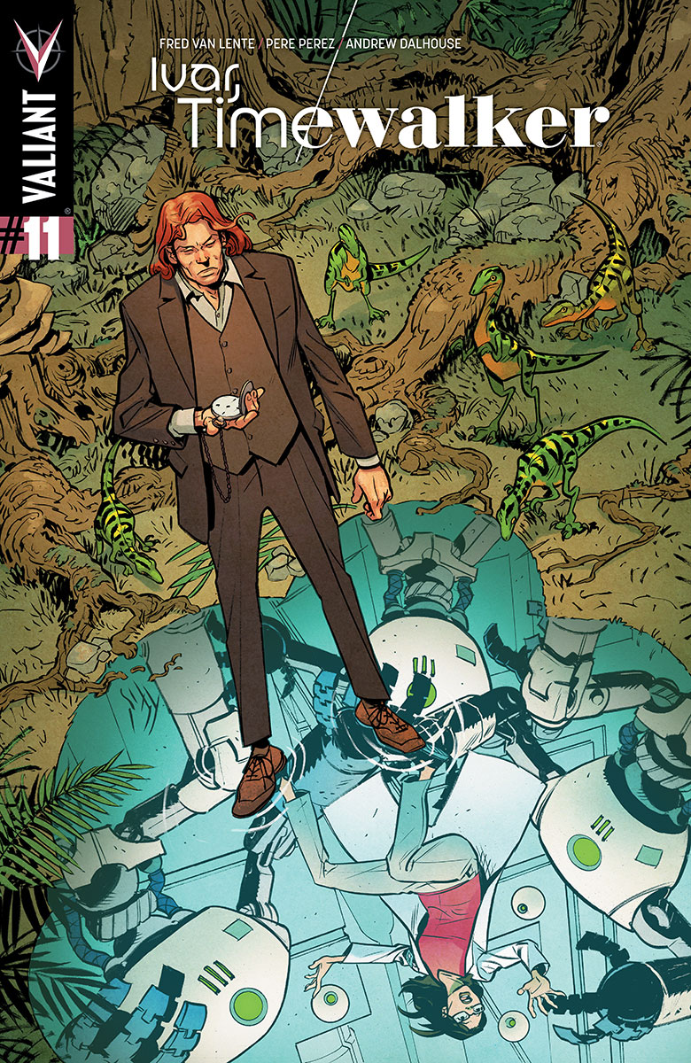 Trapped as the planet Earth whips through history at lightning speed, Ivar and Neela must confront their feelings for one another – and Neela finds herself about to make a fateful decision that may save history forever – but cost her own life! New York Times best-selling writer Fred Van Lente (ARCHER & ARMSTRONG) and Harvey Award-nominated artist Pere Pérez (UNITY) bring you one step closer to “ENDING HISTORY”!