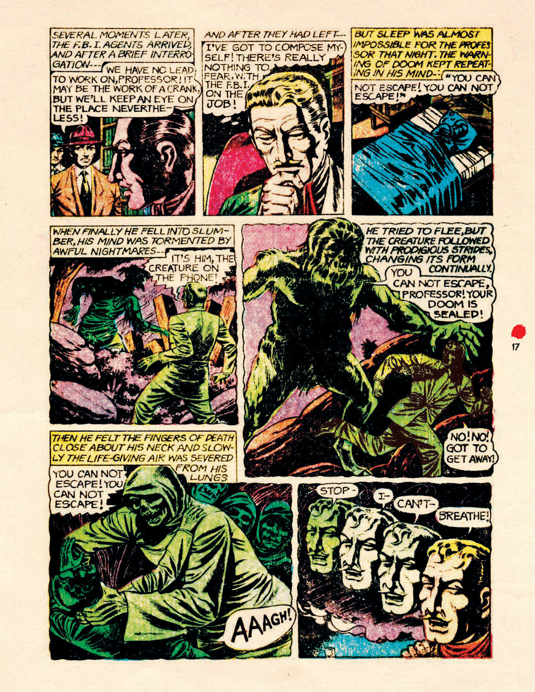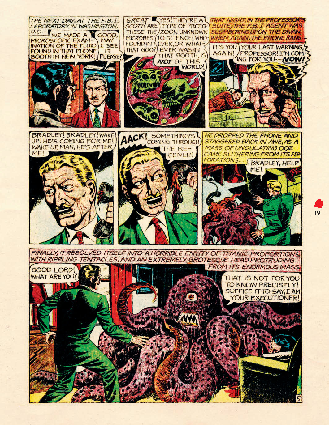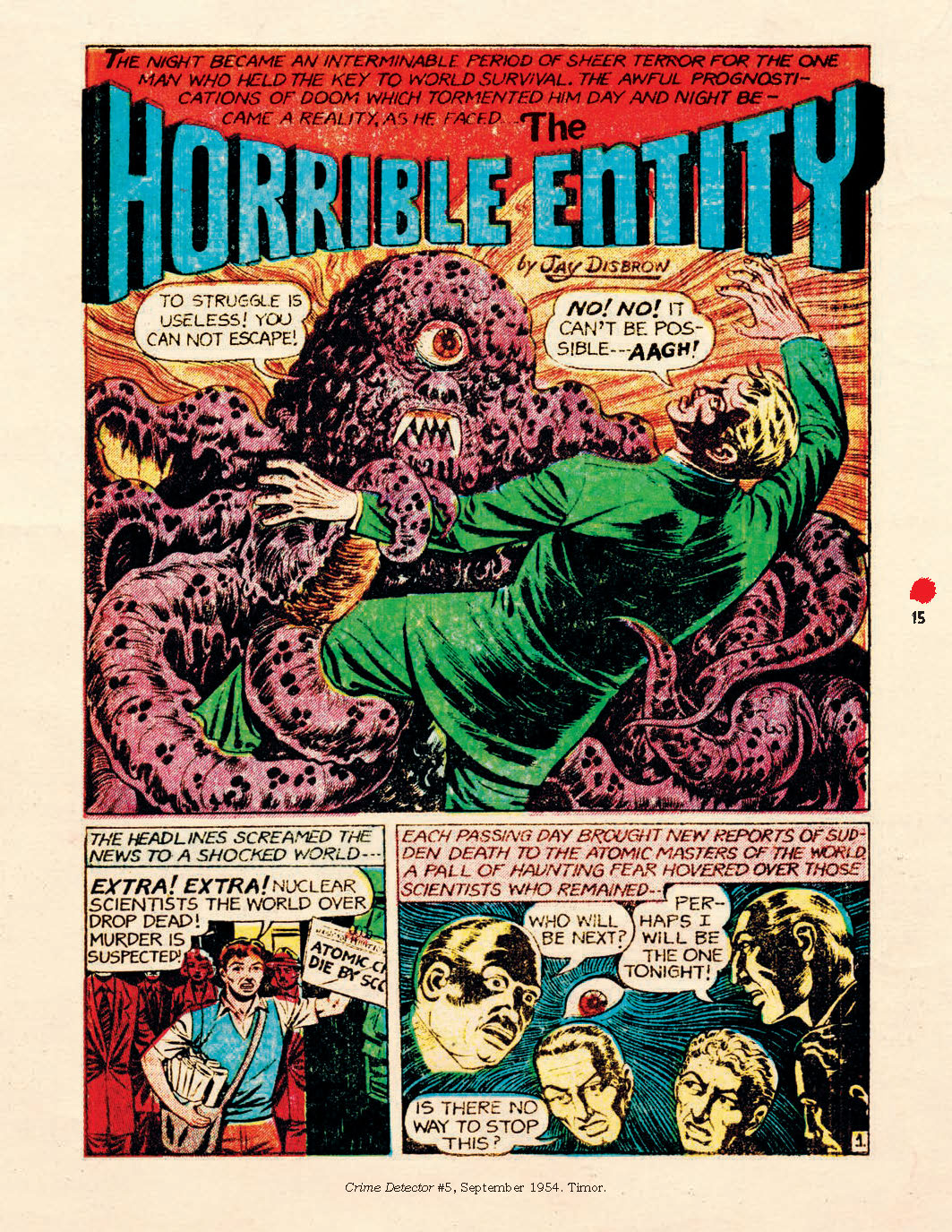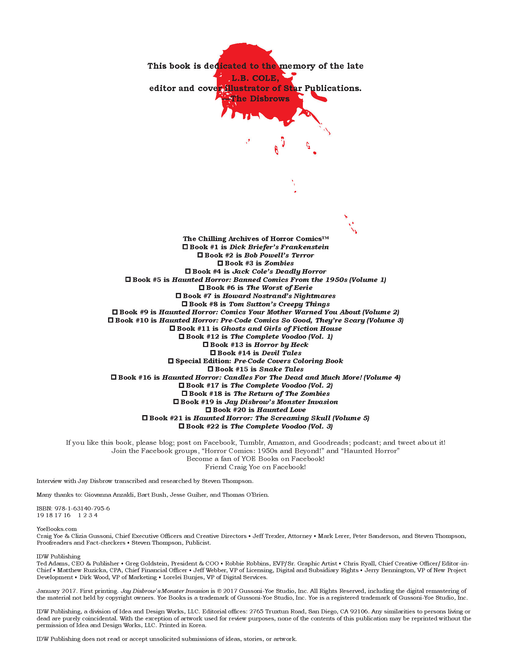 One of the most bizarre, unique stylists from Pre-Code horror comics is cult-favorite Jay Disbrow. If there’s anyone close to this unknown genius, it’s Basil Wolverton. Working with friend, editor, and colorist L.B. Cole, Disbrow wrote and drew many fear-inducing tales specializing in terrifying demons, scary apparitions, and a horde of hairy monsters. This full color, large format book culls the best of Disbrow’s work from moldy comics like Dark Mysteries, Ghostly Weird Stories, Spook, and Startling Terror Tales. A revealing and lengthy interview with the creator serves a dark, ghostly-weird, startling, and profusely illustrated introduction!