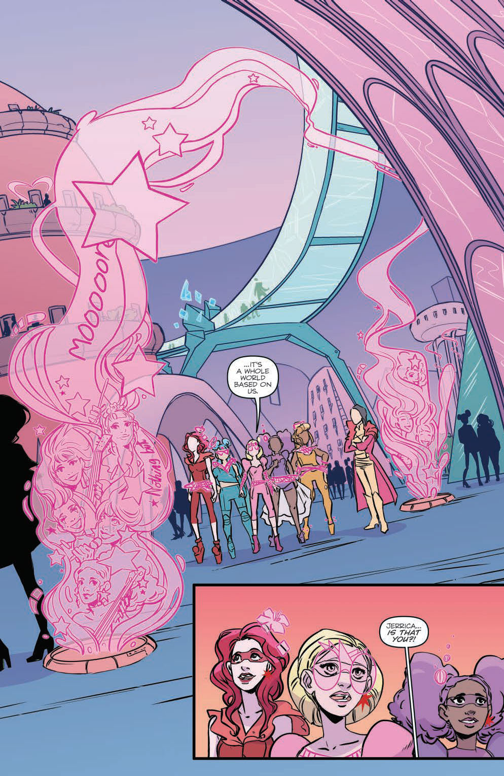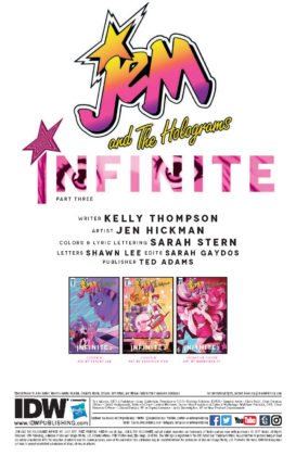 The FIRST EVER Jem/Misfits Crossover Event continues here in “INFINITE PART THREE!” Jem and The Holograms are transported to another world where they (and unlikely allies The Misfits!) must save the world from JEMCORP, a corrupt corporation that now controls all Hologram Technology!