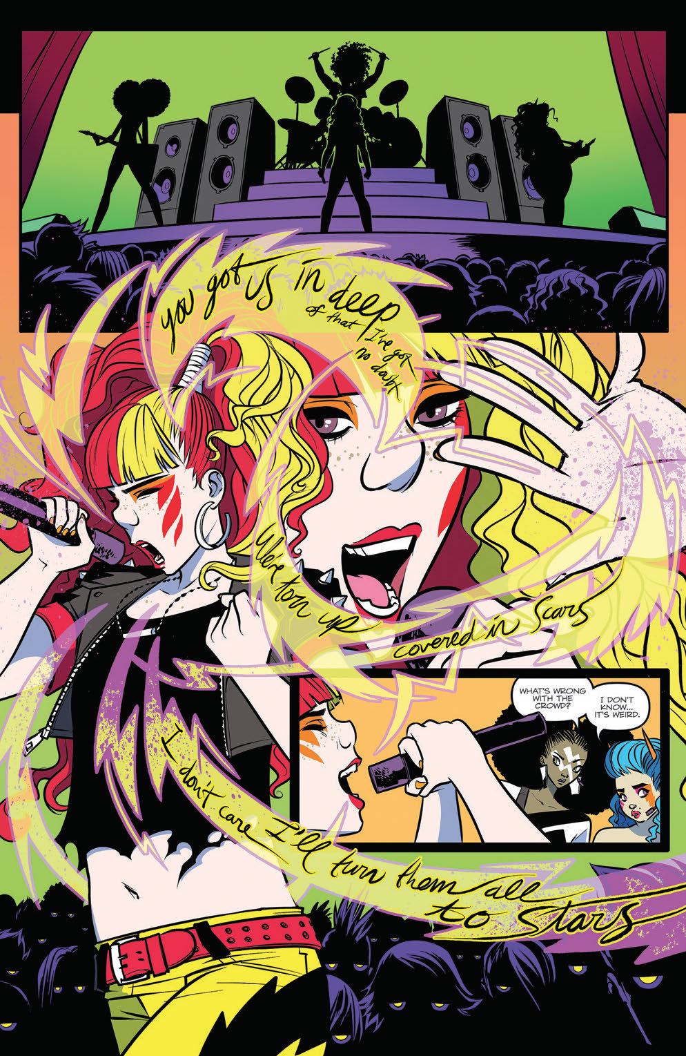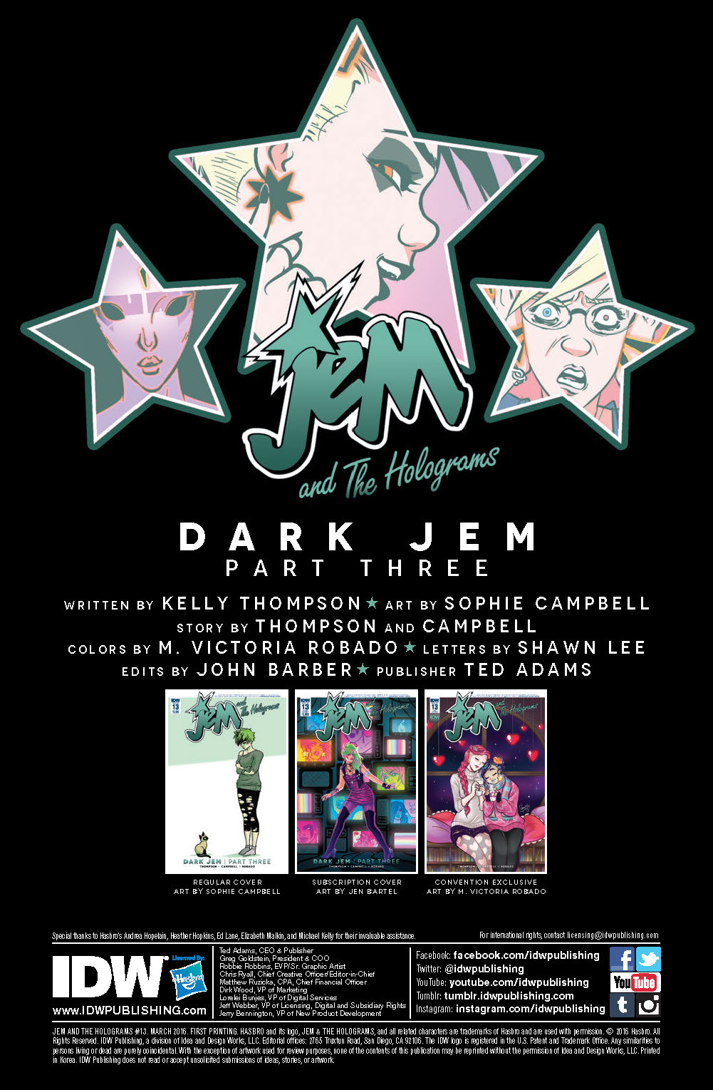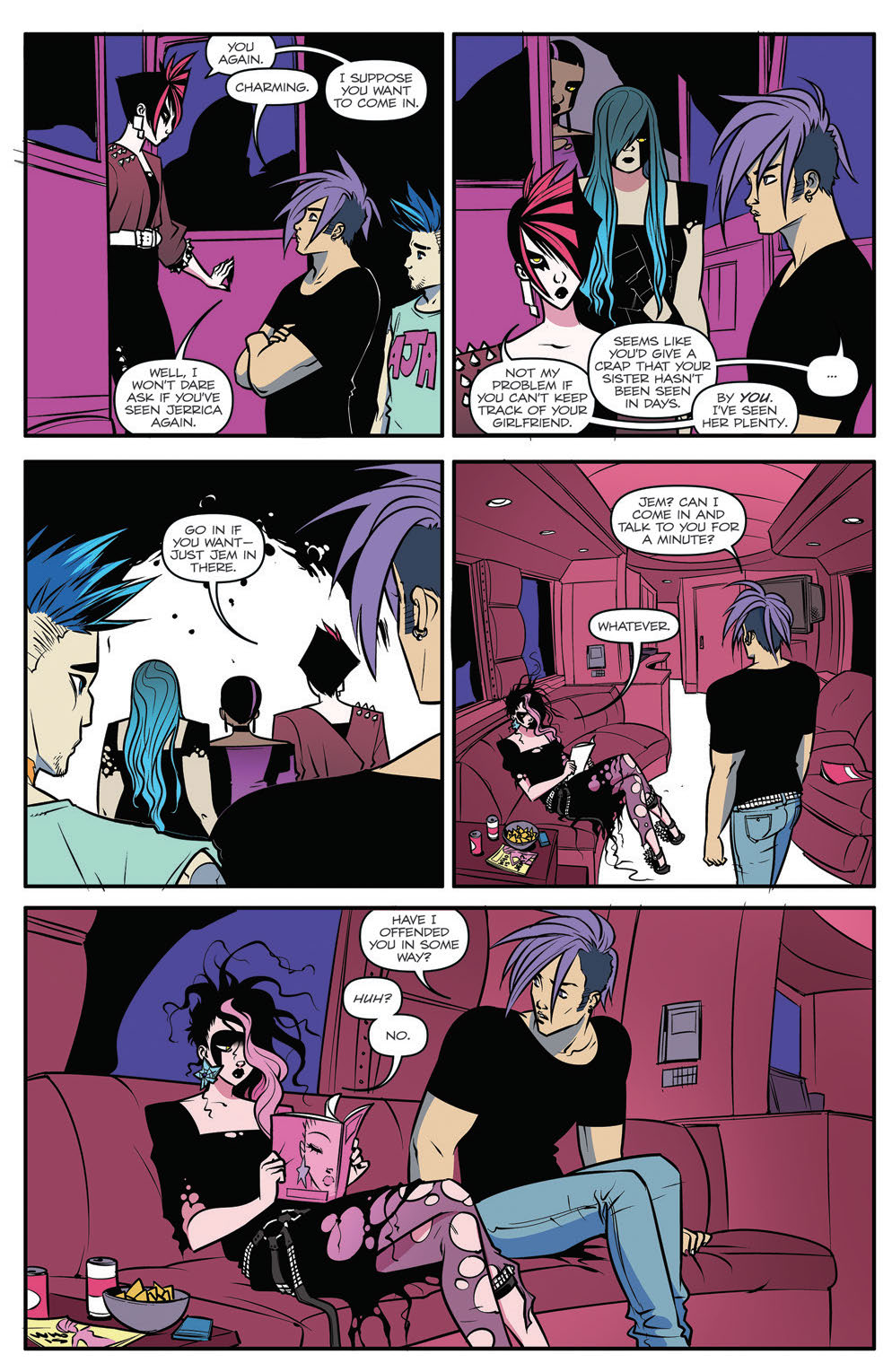 DARK JEM! Not only are JEM AND THE HOLOGRAMS not themselves but whatever is infecting them is now spreading to others every time they play. JERRICA, AJA, SHANA, and KIMBER band together—but will they be forced to destroy SYNERGY to save the world from the DARK JEM sound. Meanwhile Pizzazz makes plans to get back her band… at any cost!