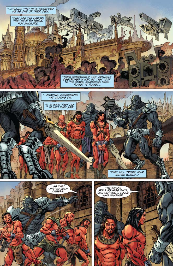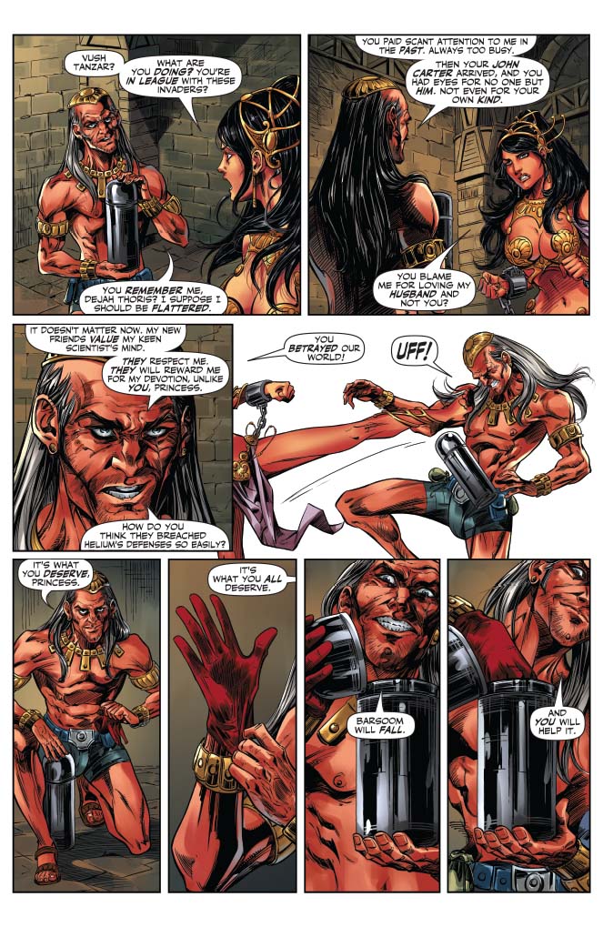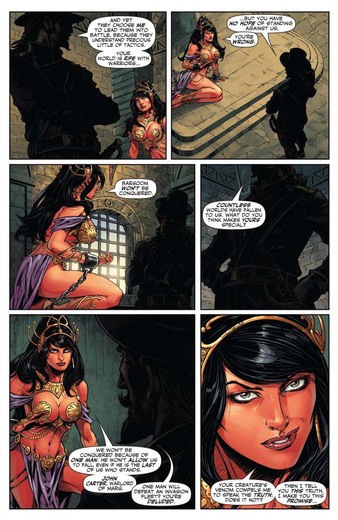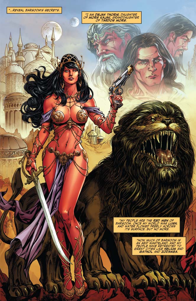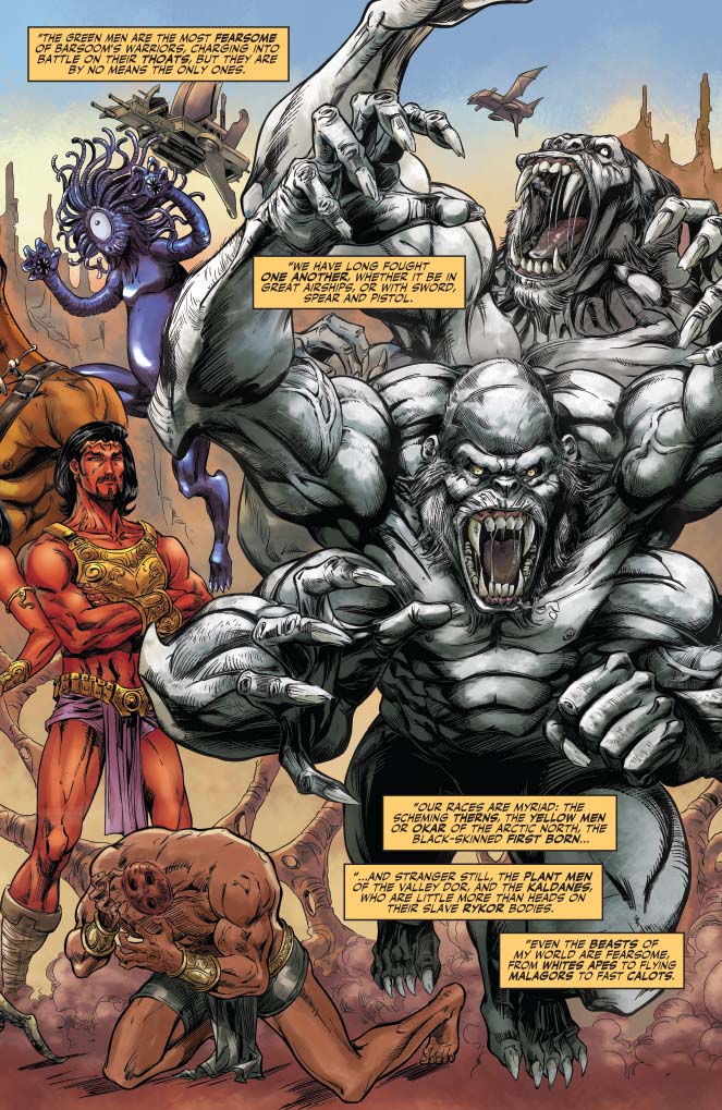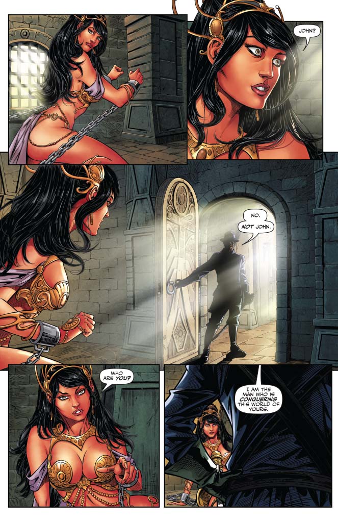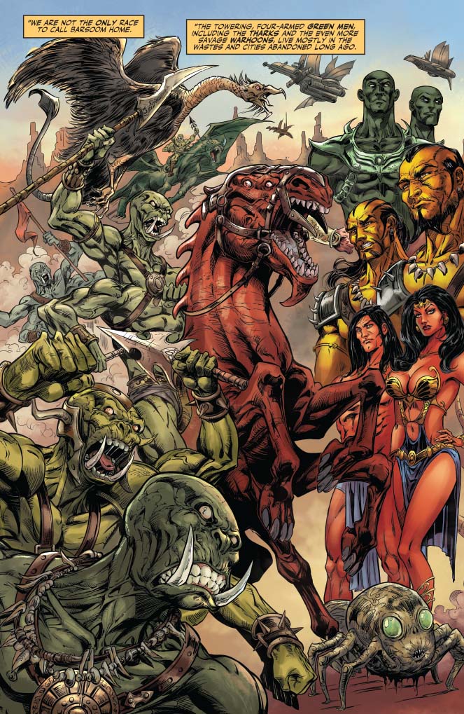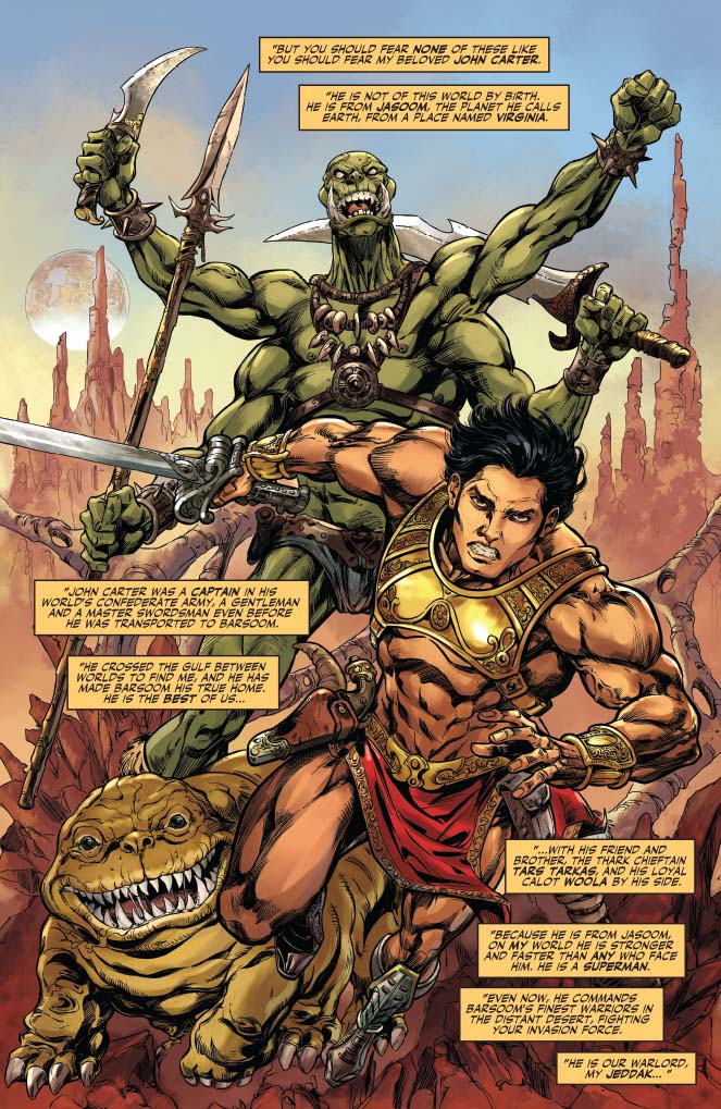 John Carter, the Confederate soldier transported to distant Mars, must save his adopted world from an adversary who is every bit his equal on the Red Planet: Captain Joshua Clark, formerly of the Army of the Potomac and now the strategist for a species of star-hopping conquerors. While Carter and his staunch ally, the Thark chieftain Tars Tarkas, lead a legion of united Green Men and Red Men against the alien assailants, Dejah Thoris — the princess of Barsoom — is held captive by the bloodthirsty Clark in the fallen city of Helium. The “Invaders of Mars” storyline is cosmic-scale action and adventure, courtesy of Ron Marz, the groundbreaking writer of Green Lantern!