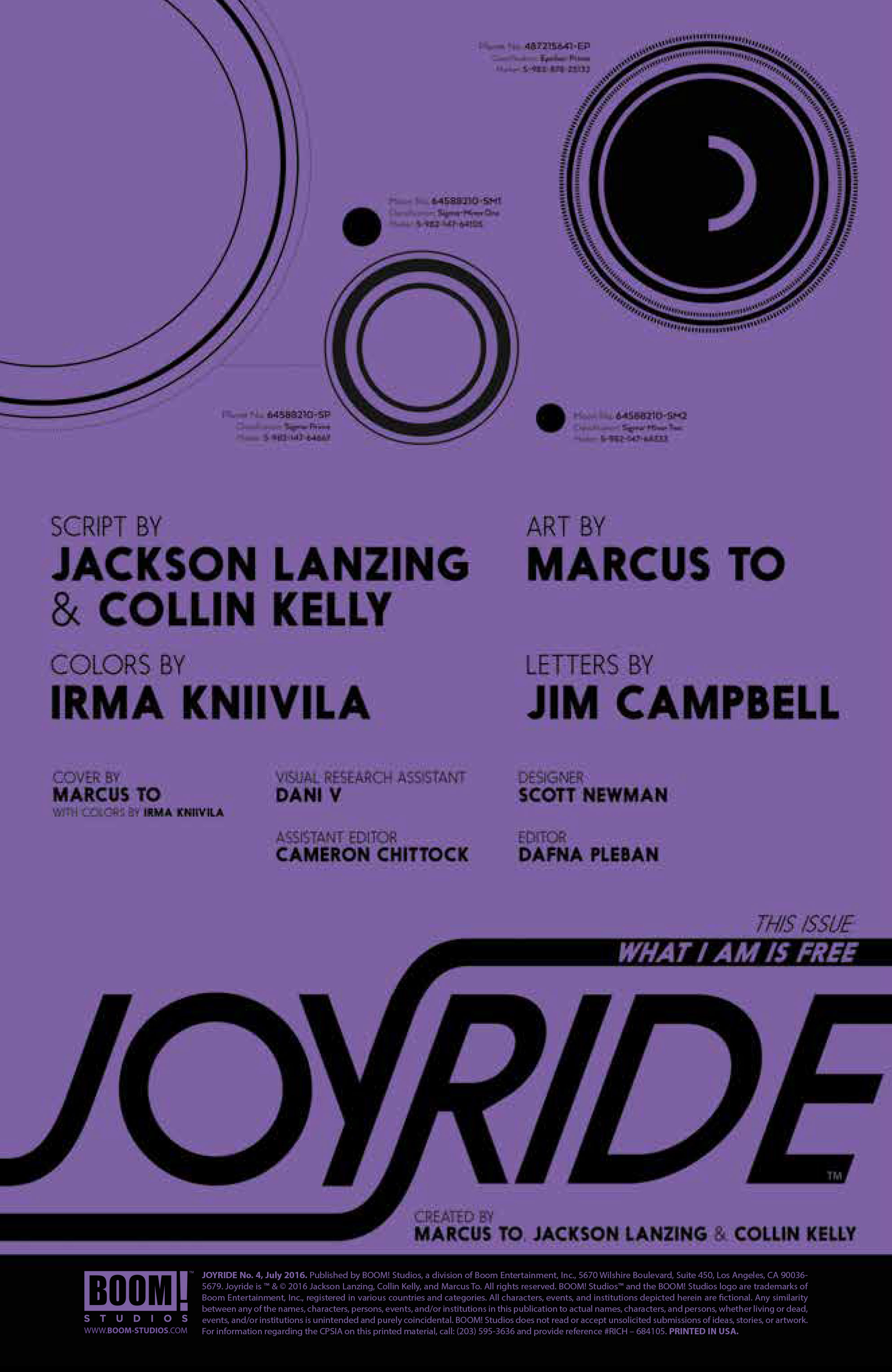 PreviewsBOOM! Studios Previews JOYRIDE #4 By Comix Asylum - Jul 17, 2016 0 628 FacebookTwitterPinterestWhatsApp Joyride #4 Publisher: BOOM! Studios Writers: Jackson Lanzing & Collin Kelly Artist: Marcus To Cover Artist: Marcus To Price: $3.99 Synopsis: Dewydd and Catrin explain their pasts to Uma, who might have to continue the joyride on her own. JOYRIDE #4 1 of 7