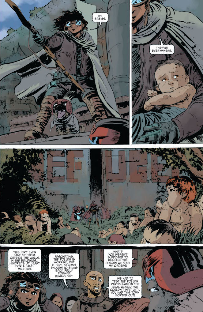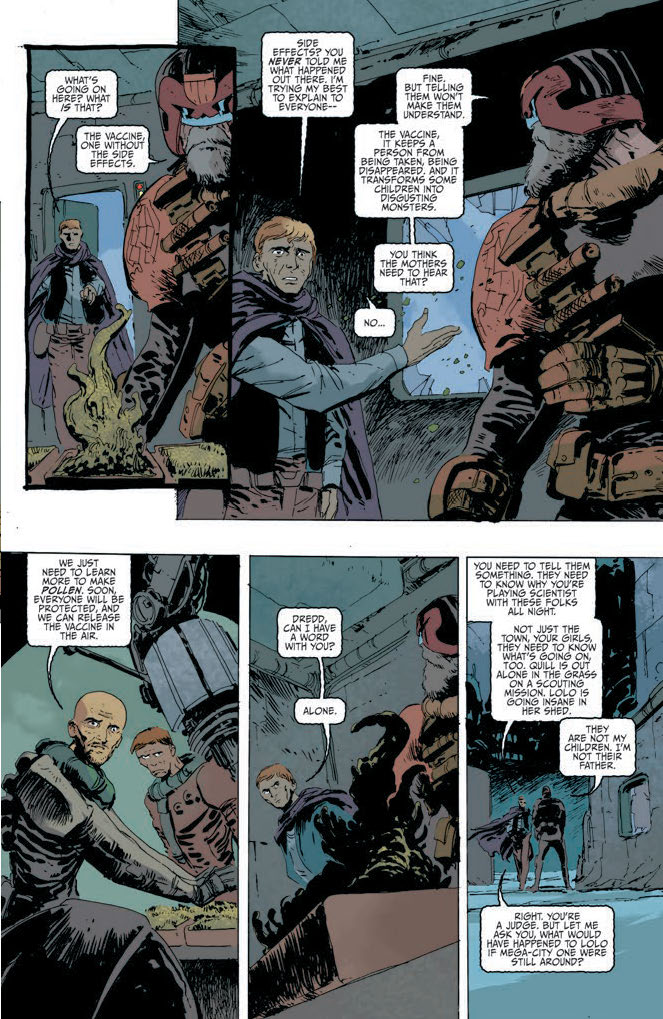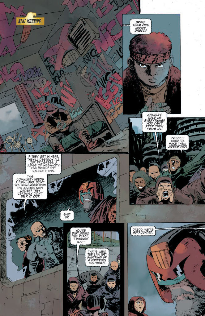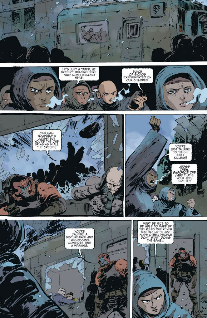 Dredd finds himself the only judge in a Mega-City One that he barely recognizes. Joined by a trio of feral girls, he has taken on his most challenging case: to uncover what happened to the city he has sworn to serve and protect. Lolo, Quill, and Dredd are invited into The Refuge, a grammar-obsessed settlement but Dredd uncovers some Dark Judge cultists who have been stealing babies for their experiments into the secrets of The Green. Collects issues #9–12.