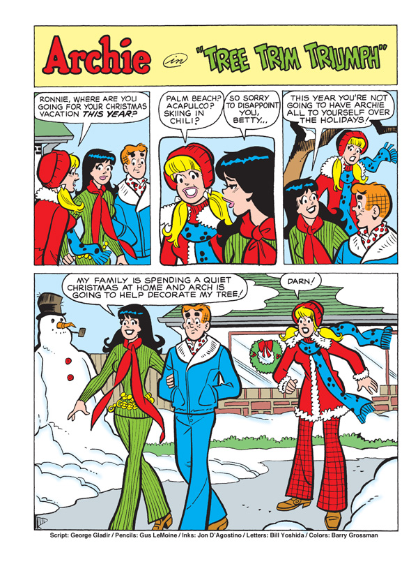 Christmas is coming to Riverdale! Archie and Jughead decide to score points with their principal, Mr. Weatherbee, by generously donating a Christmas tree to Riverdale High. They choose the best—and biggest—tree the Christmas tree farm has to offer. But when the boys run into some issues with transporting the gigantic fur, their generous idea may turn into more trouble than it’s worth! Find out if they can get on Mr. Weatherbee’s good side and spread some Christmas cheer—or if they’ll be spending their holidays in detention in “Trees are the Times,” the hilarious holiday brand new story that starts off this Comics Annual!